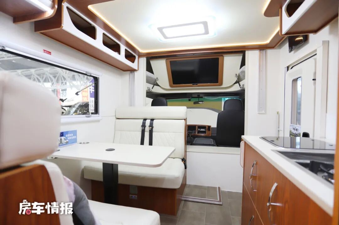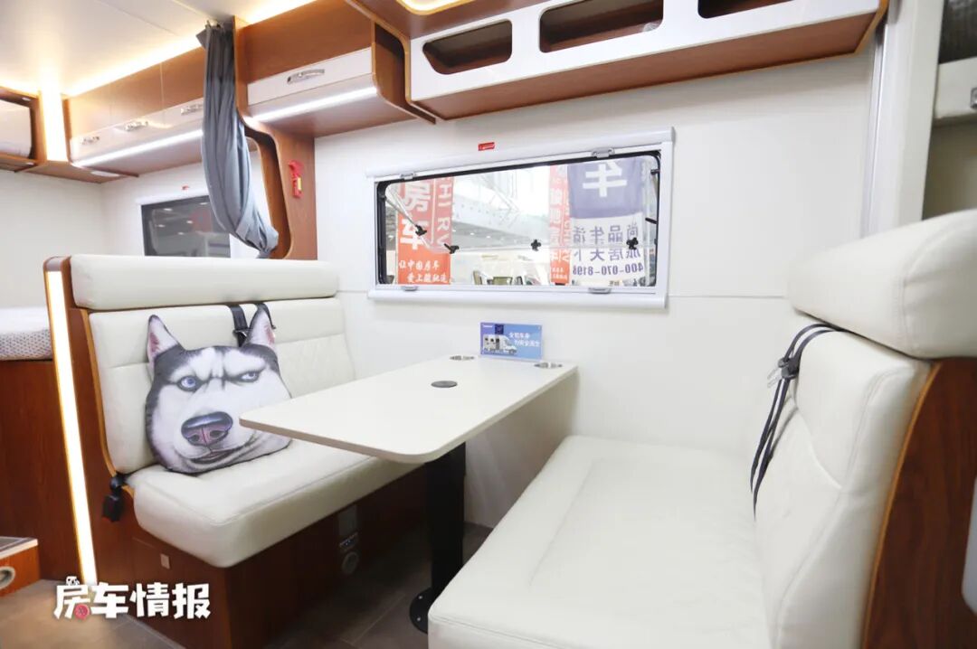 驾驶室后方是全车的会客区,由两排对坐沙发和一张可升降的餐桌组成,沙发座椅采用皮质软包的工艺,大大提升了乘坐舒适度,并且配备了四条安全带,所以整车在行驶过程中一共可以乘坐7个人。