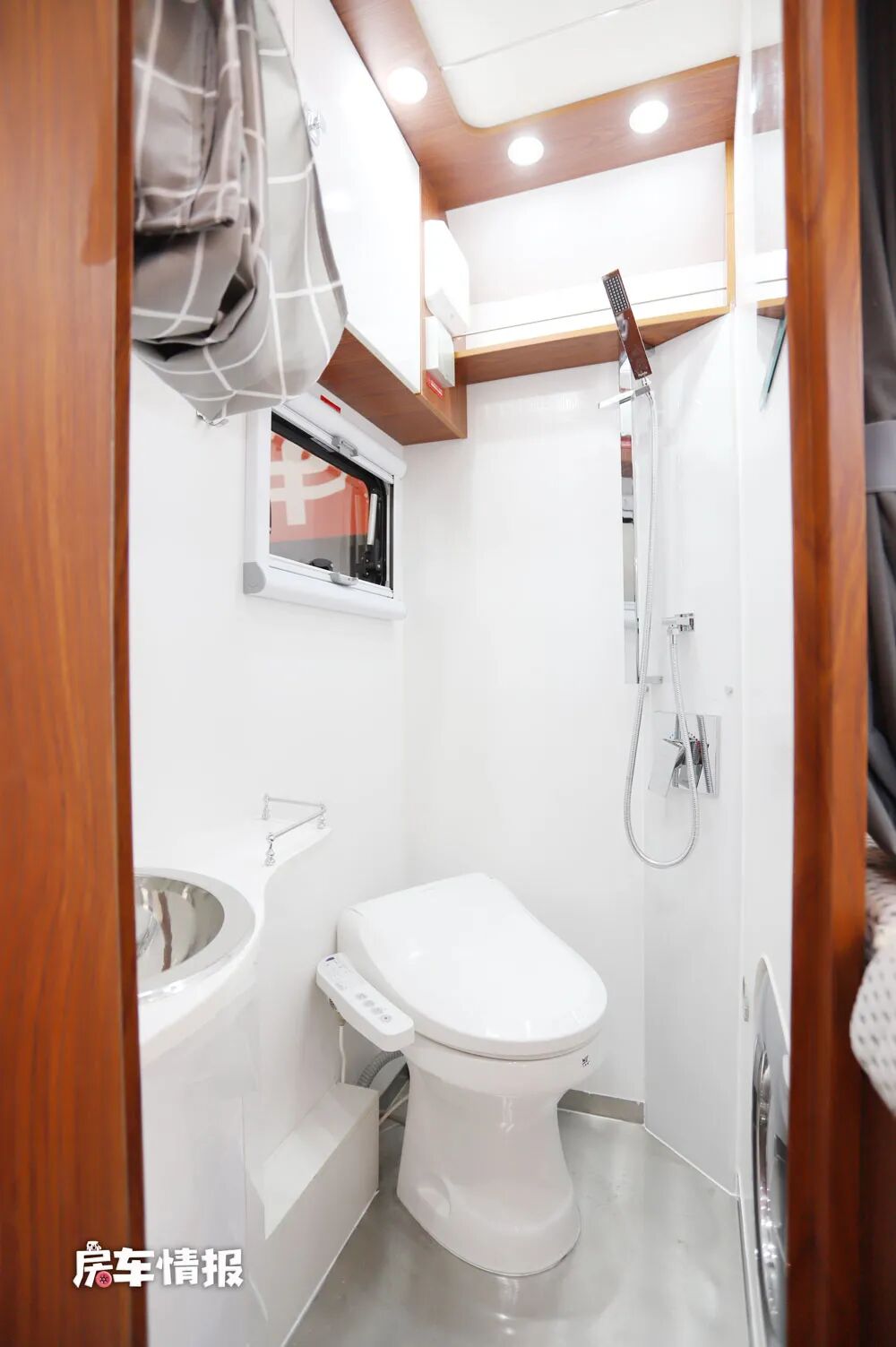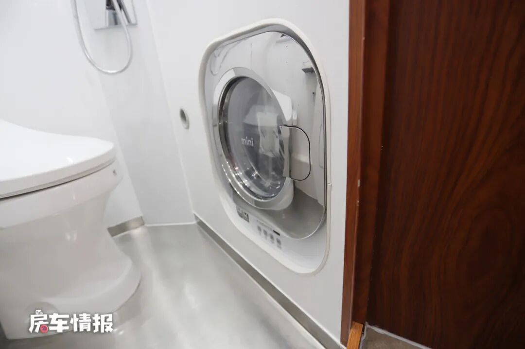 尾床旁边是一间单独的卫浴室,里面的洗漱设施也比较齐全,包括马桶、洗手台、淋浴花洒、储物柜和换气扇,侧面的壁板上还暗藏了一台小型的洗衣机,配备一应俱全,完全能够满足平时洗漱的需求。