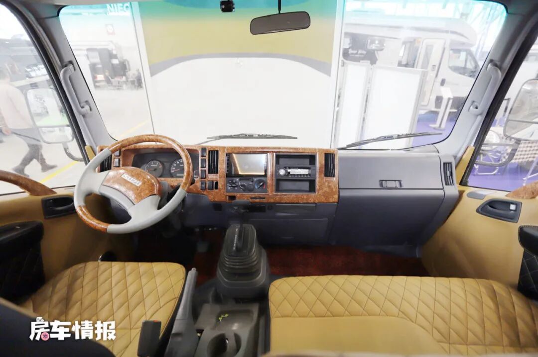 驾驶室的设计还是和普通的C型房车有所区别的,空间更宽敞一些,驾驶座椅也采用了一主二副的设计方式,木质纹路的中控台与座椅的橙黄色非常的搭配和谐。