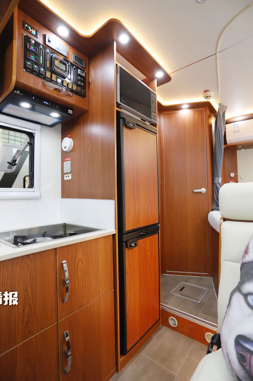 乘客门后方的厨房区还是采用了标准的设计,台面面积并没有因为车型的原因而变大,同样提供了一个带盖的洗菜池和一个单眼的燃气灶。