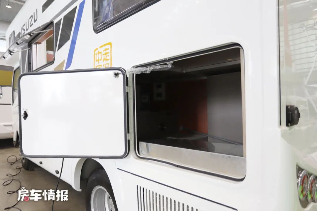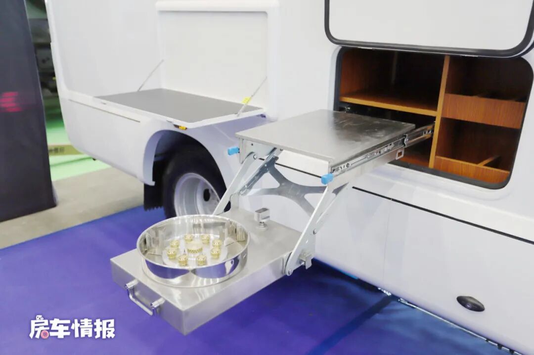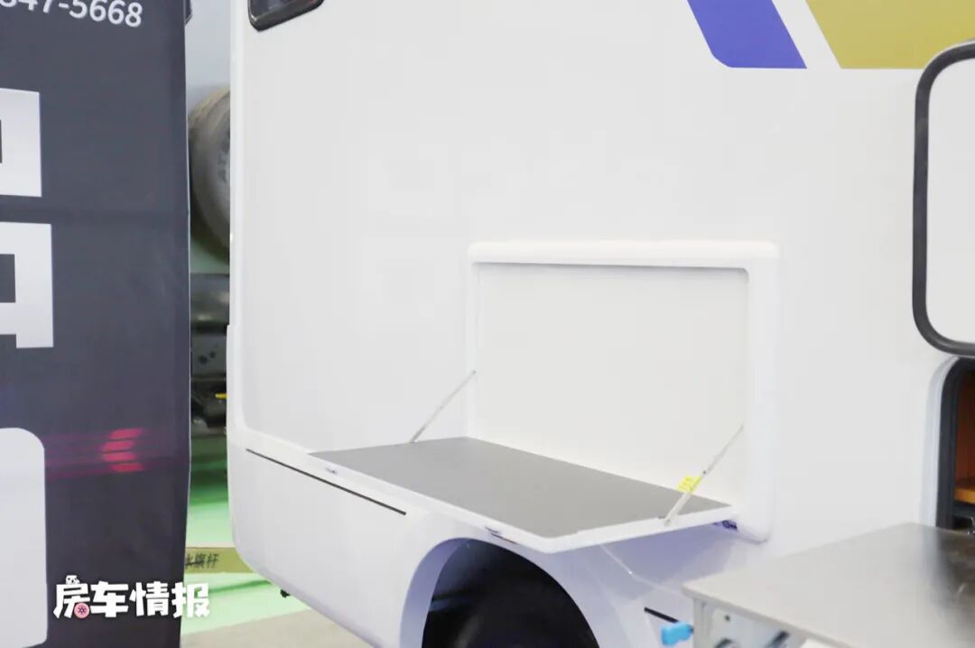 基本的车身外部配置依旧不能少,右侧上方的手动遮阳棚,下方的抽拉式燃气灶,外置翻板,外置淋浴花洒,还有乘客门下方的电动踏步,都非常的齐全。