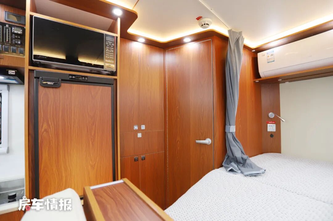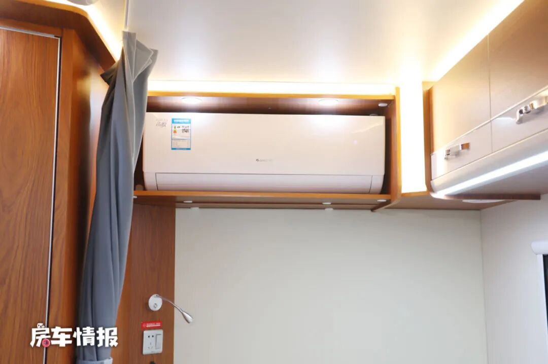 车厢尾部的休息区提供了一张纵置的双人床,平时可以容纳两个成年人休息使用,床头处提供了小夜灯和充电接口,上方则配备了一台家用变频空调,侧面上方还提供了三个储物吊柜,平时可以放一些衣物,也方便拿取。