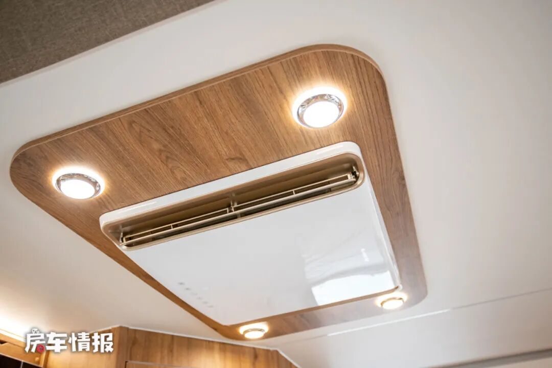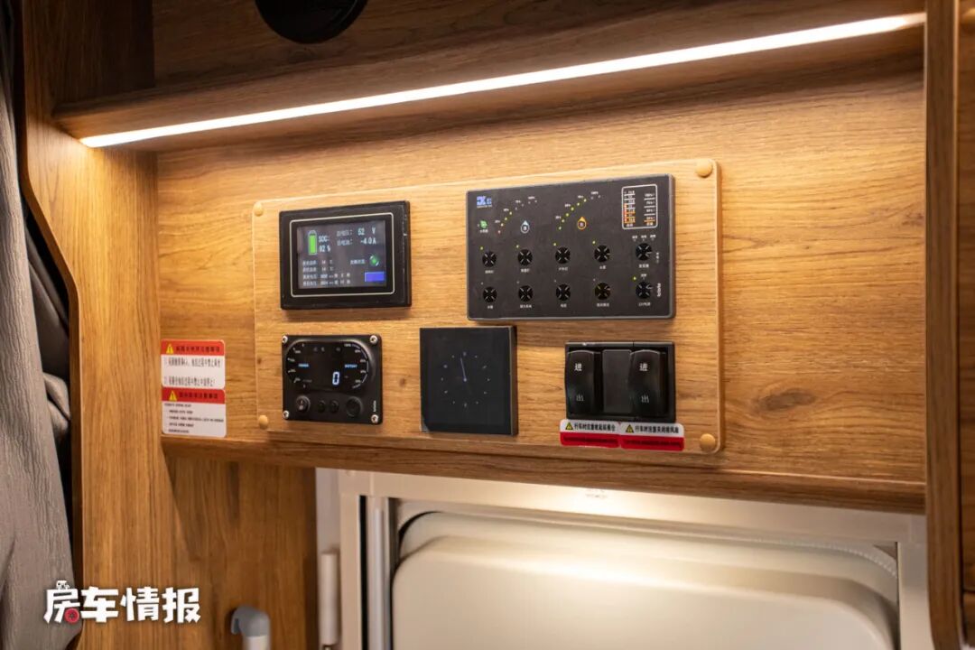 电路上,这款房车搭载了一台3000W的逆变器,提供48V 200Ah锂电池,顶部还配置了650W的太阳能电池板,相当于车内带有10.2度电;水路上则拥有250L清水箱和50L灰水箱,完全可以满足日常的生活需求。另外车内顶部配置了一台1P的格力顶置空调以及5000W的燃油暖风热水一体机。