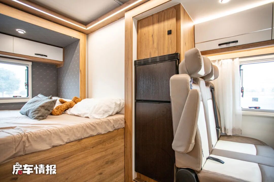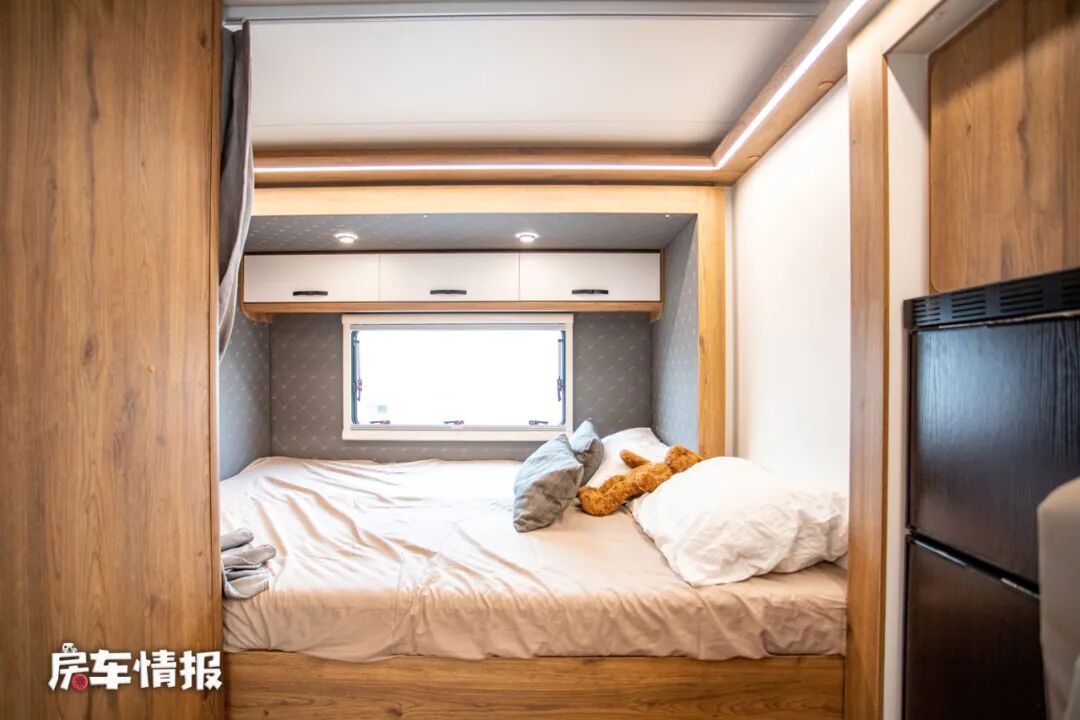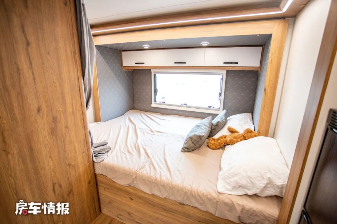 车厢尾部的拓展舱内是一张横置的双人床,其横向尺寸为1.6米,足够躺下两个成年人,我觉得一家三口都没有问题。