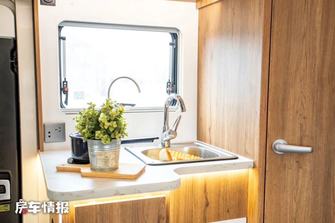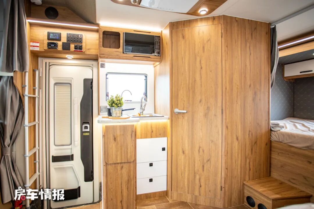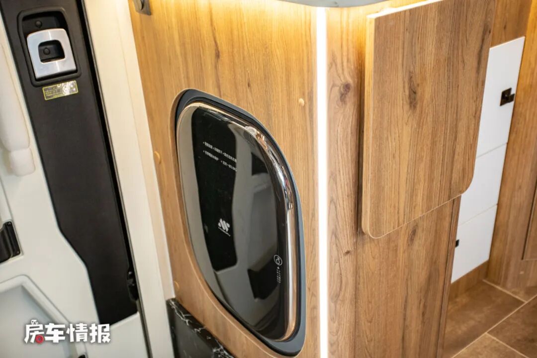 厨房操作台位于乘客门后方,是一个L型的吧台式设计,并带有可拓展的桌板用来备菜使用,台面上带有电磁炉和不锈钢水槽,并提供直饮水功能,上方嵌入了一台微波炉,下方则是多个储物空间,满足日常的烹饪需求。侧面还提供了一台洗衣机,可以说整车的生活配件是相当齐全了。
