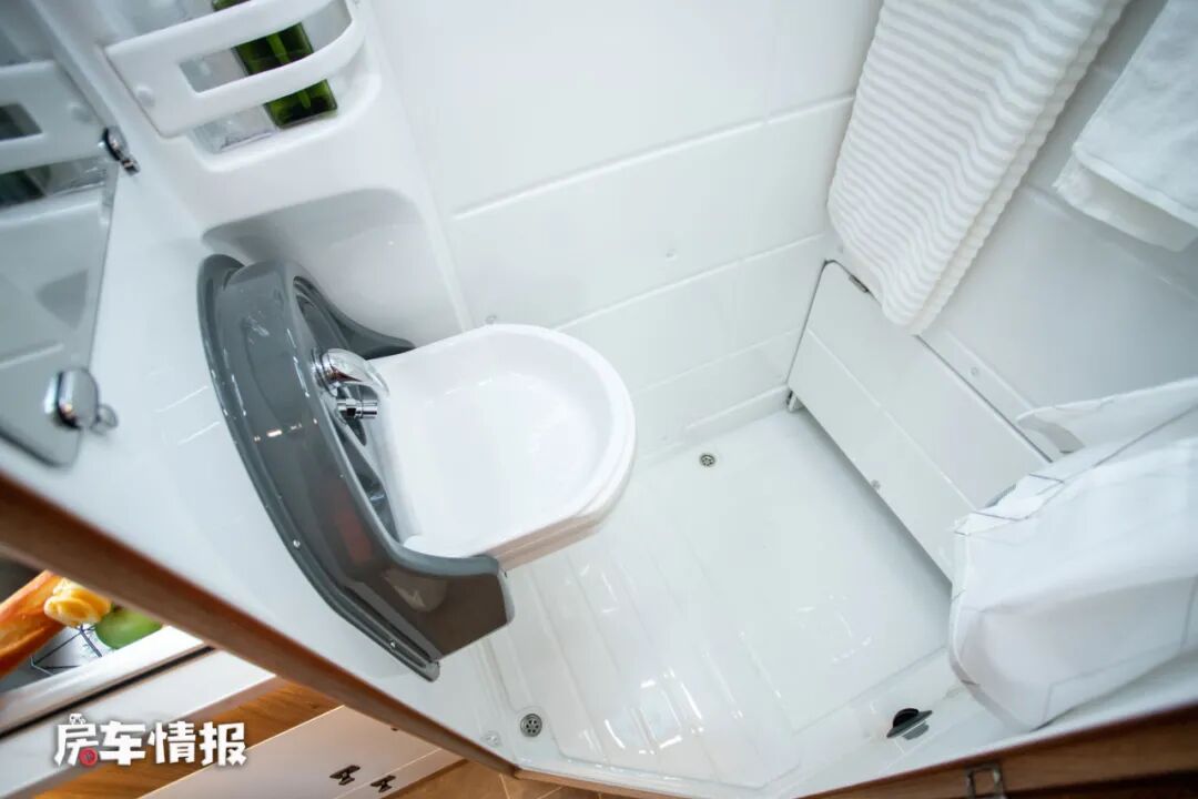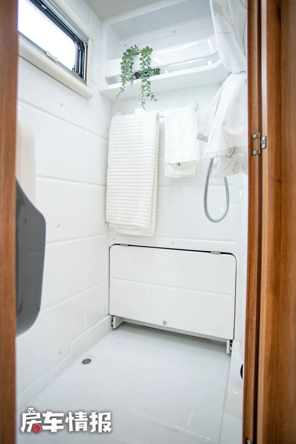 厨房区后方是全车的一体吸塑式卫生间,可以防水防潮延长整体使用寿命,另外卫生间内还隐藏了一台电动伸缩马桶,平时淋浴时可以将其收缩回去,这样脚下的空间就非常宽敞了,另外还提供了可翻折的洗手台盆、置物架等设施,满足日常的洗漱需求。