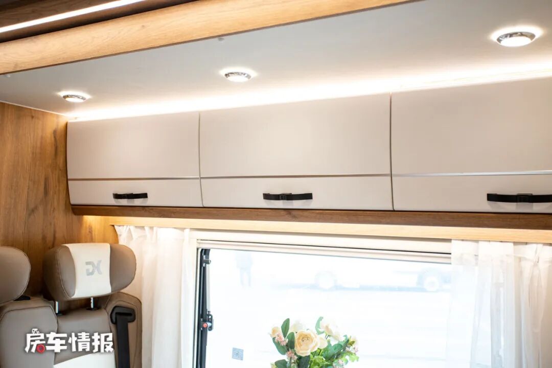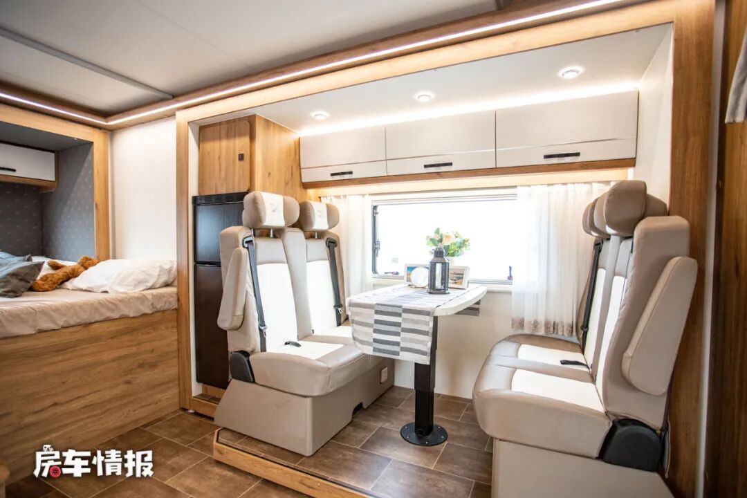 在侧面拓展舱内是全车的会客区,采用经典的四人对卡座+升降餐桌设计,不过日常行驶拓展舱不能打开,但可以乘坐四个人,顶部还提供了基础的吊柜,满足储物的需求。