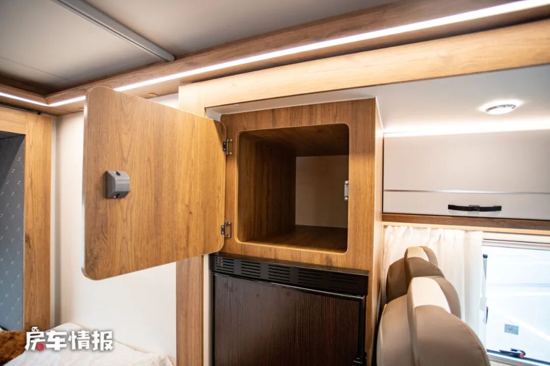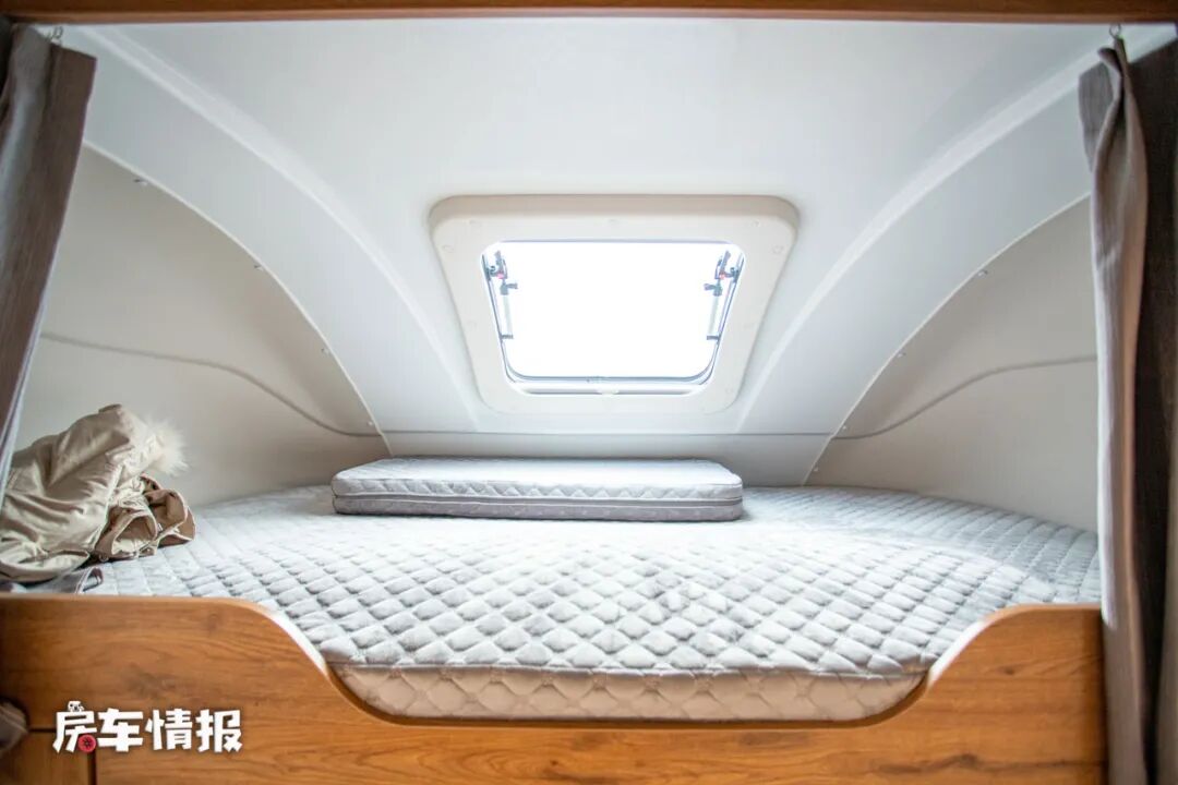 在驾驶室上方依然是保留了经典的额头床设计,尺寸为2200*1300mm,可以容纳两个人使用,而顶部的天窗也使整体区域特别的通透明亮。