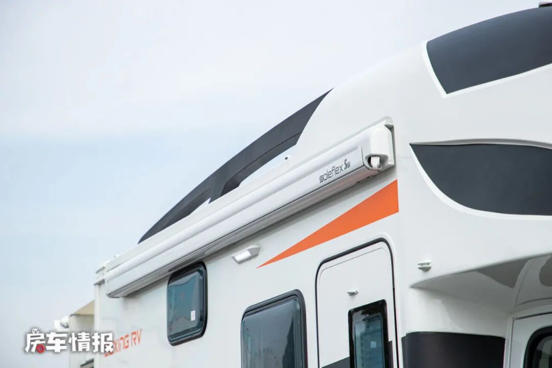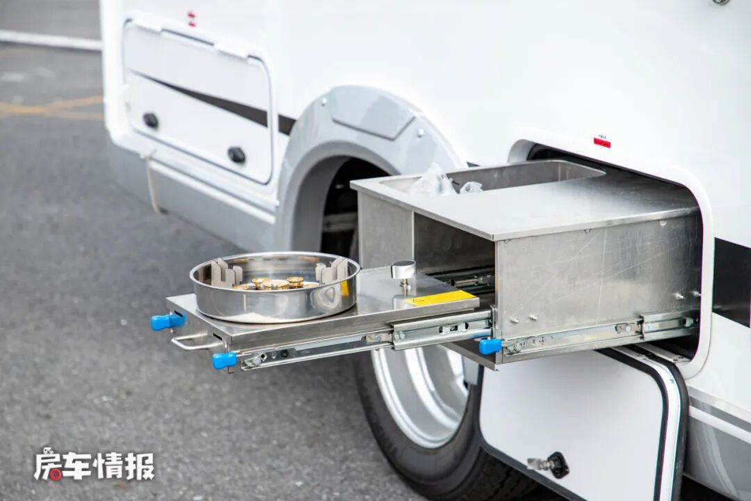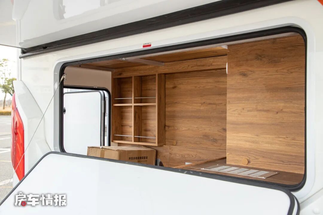 车身车身外部配置也是比较齐全的,带有手动遮阳棚、调料架、抽拉燃气灶,水电接驳口以及位于尾部的贯通式超大行李舱,内部还带有小型的置物架,可以说配备非常齐全了,完全能够满足在车外的生活需求。
