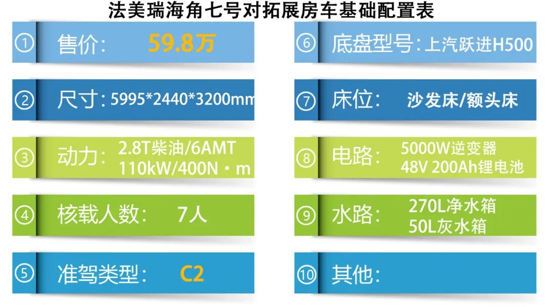 这款国内首款搭载上汽H500底盘所打造的对拓型轻卡房车法美瑞海角七号,不仅自带轻卡房车的大空间属性,而且加入了拓展舱之后更加提升了整体空间,另外出厂自带10度电也能解决出行无忧的问题,现在这款房车的报价为58.8万元,结合整体的配置,您觉得如何呢?