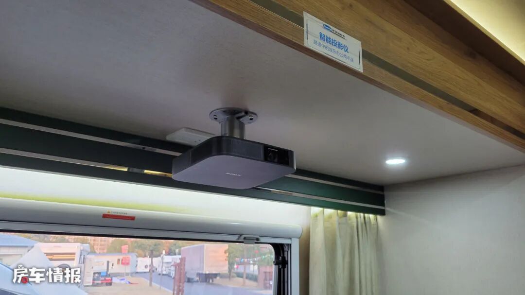 在左侧拓展舱内顶部,还悬挂了一台投影仪,结合右侧拓展舱内的幕布,也可以打造一个私人的影音视听环境。