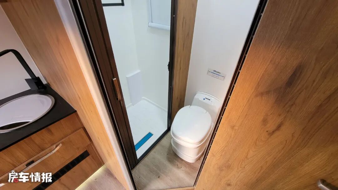 与之相对的是全车的独立卫浴室,而且采用了干湿分离的设计,外侧为卫生间,同时还嵌入了一台mini洗衣机,打开推拉门之后内侧则为淋浴间,日常的洗漱需求均可解决。