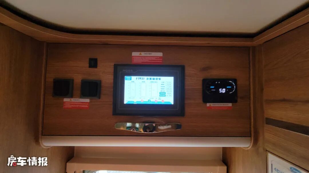 电路上,这款房车搭载了一台48V 5000W的逆变器,提供48V 200Ah的磷酸铁锂电池,相当于10度电,而且整车的电路控制系统采用触摸式设计,操作方便且简单;水路上全车拥有270L的净水箱和50L的灰水箱,足够满足日常的生活所需。