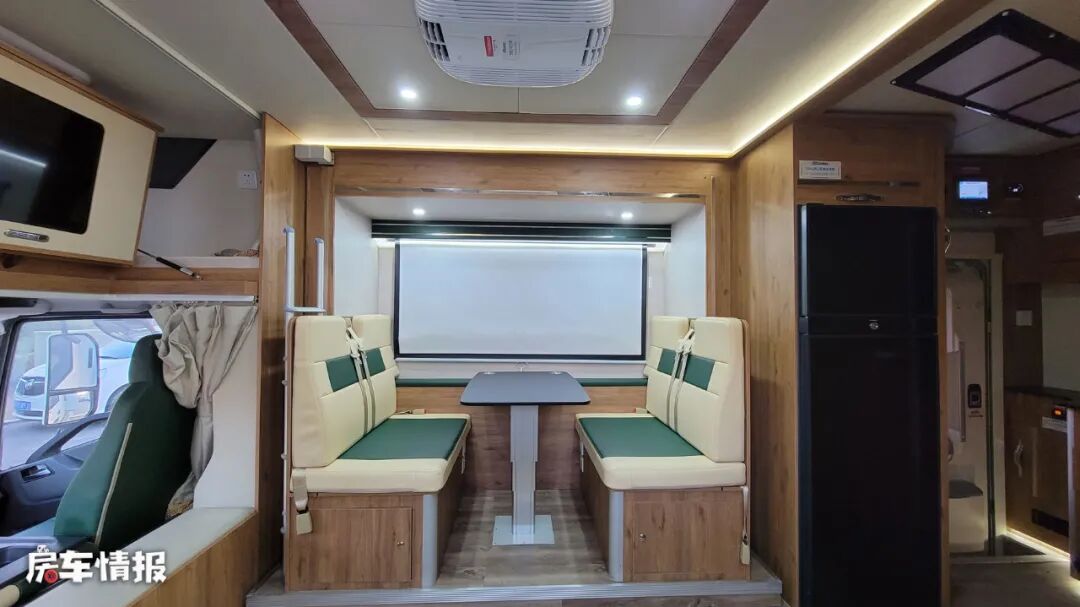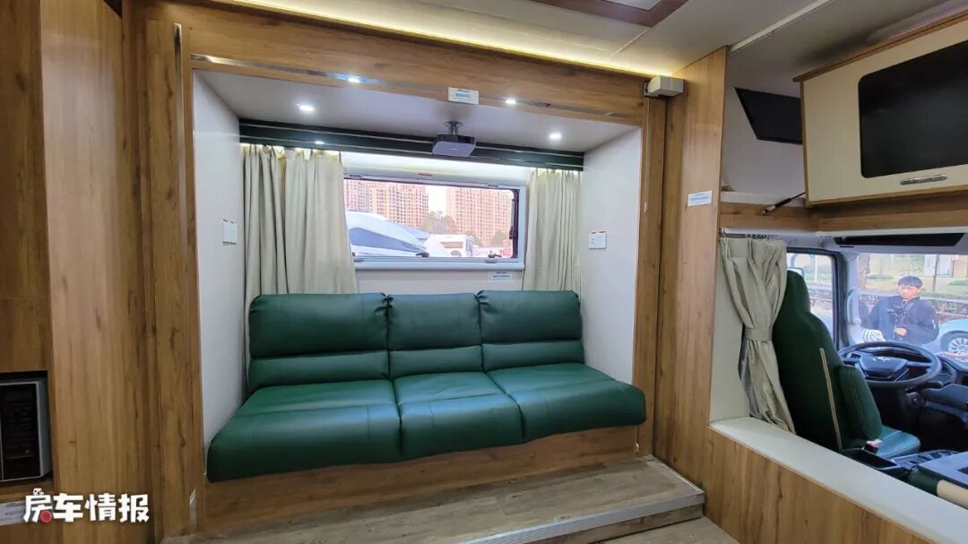 因为全车采用了对拓的设计,所以整车采用了右后上门的设计,进入车厢内部,整体的配色还是很田园清新的,尤其是沙发也采用了呼应驾驶室座椅的同款绿色,看起来使整体的色调更为统一协调。