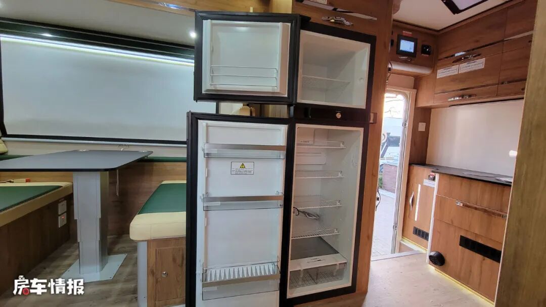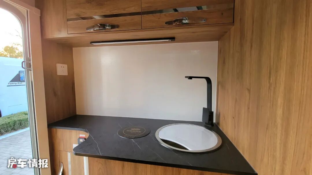 后置乘客门匹配的是后置厨房区,采用L型的设计,台面上带有圆形的水槽以及电磁炉,上下方则都提供了储物空间,而224L的上下双开门冰箱则位于乘客门前方,可以分类存放日常的食材,满足日常需求。