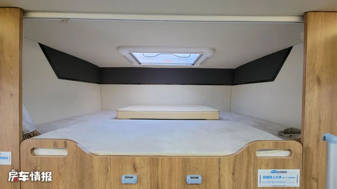 最前方驾驶室上方的额头区域内,标配一张尺寸为2100*1500mm的额头床,因为是平头的设计,从里到外整体的高度都基本保持一致,所以空间上毋庸置疑,顶部还配置了一扇小型的天窗,可以为此区域带来不错的采光度。