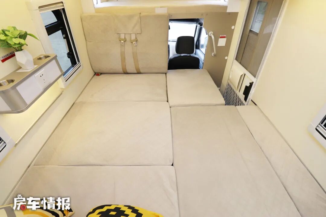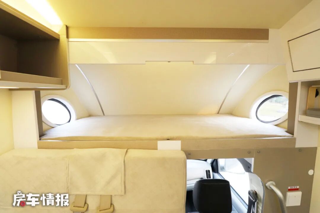 最前方驾驶室顶部也标配了一张额头床,尺寸为1600*900mm,平时可以睡两个小朋友,当然如果两个人用房车,也可以作为基础的储物空间,额头床两侧都带有外推窗,可以保证这个区域的采光度。