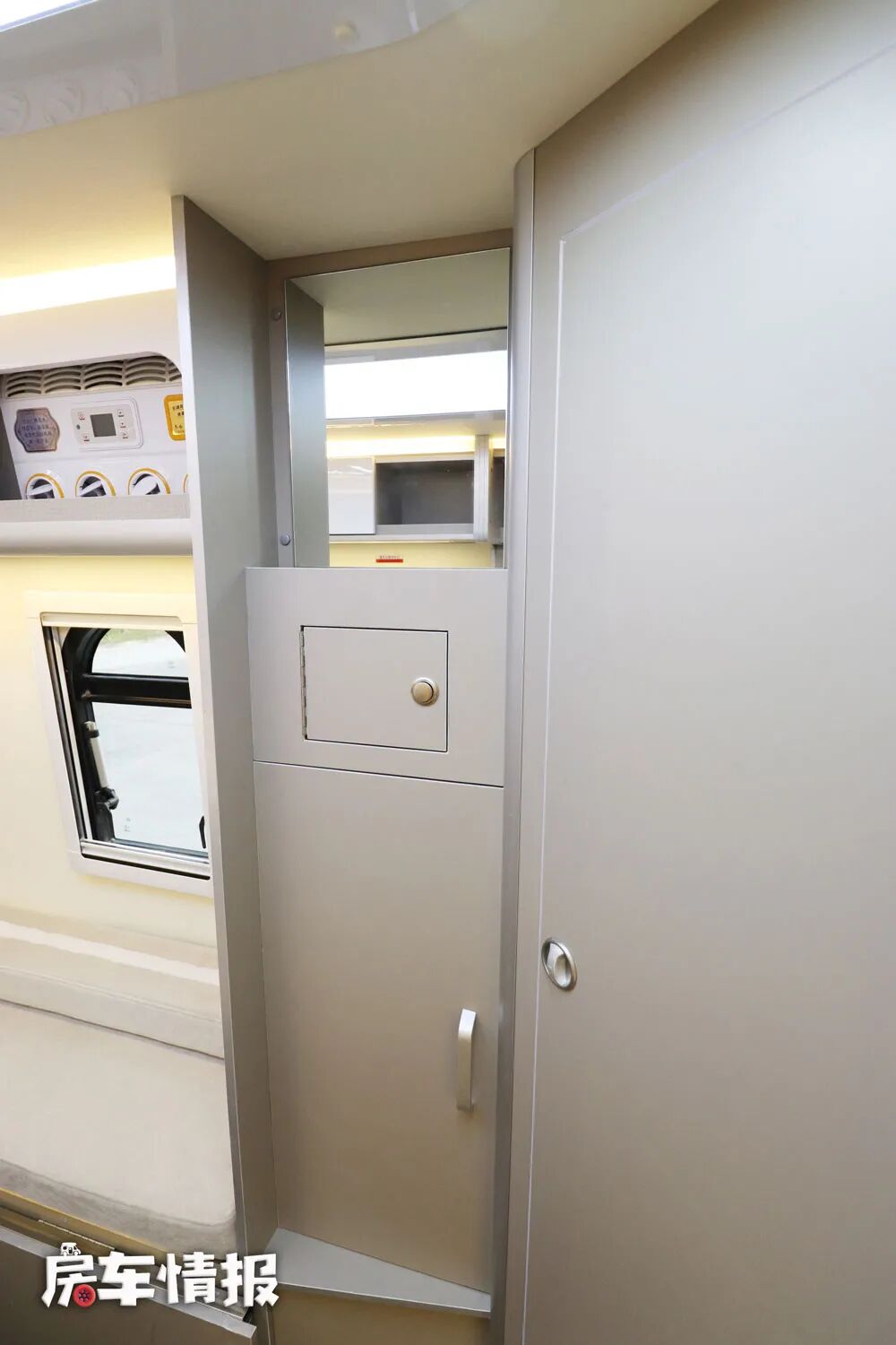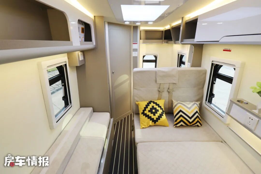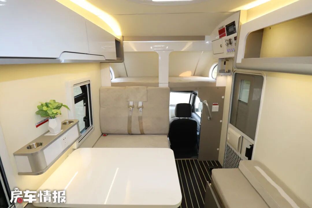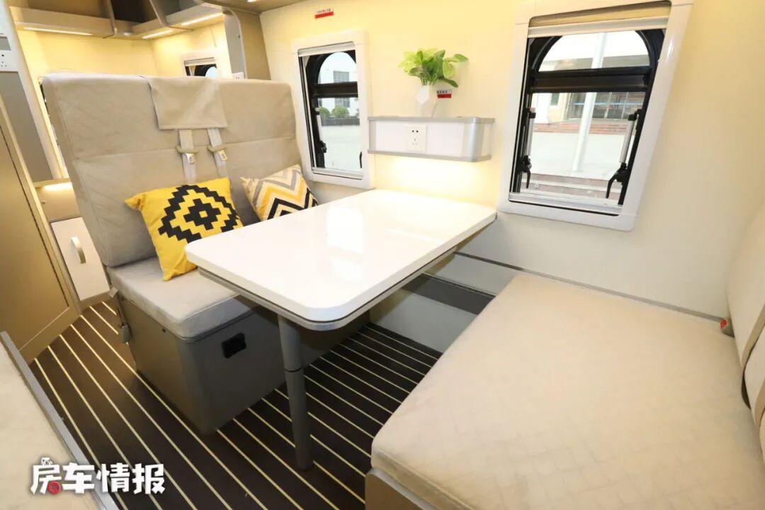 乘客门正对的是全车的会客区,采用四人对卡座+餐桌的布局设计,并配置了四条安全带,和我们平时常见的大尺寸观赏窗不同的是,这款房车会客区的窗户是两扇小型的外推窗,更像是高铁上的设计。
