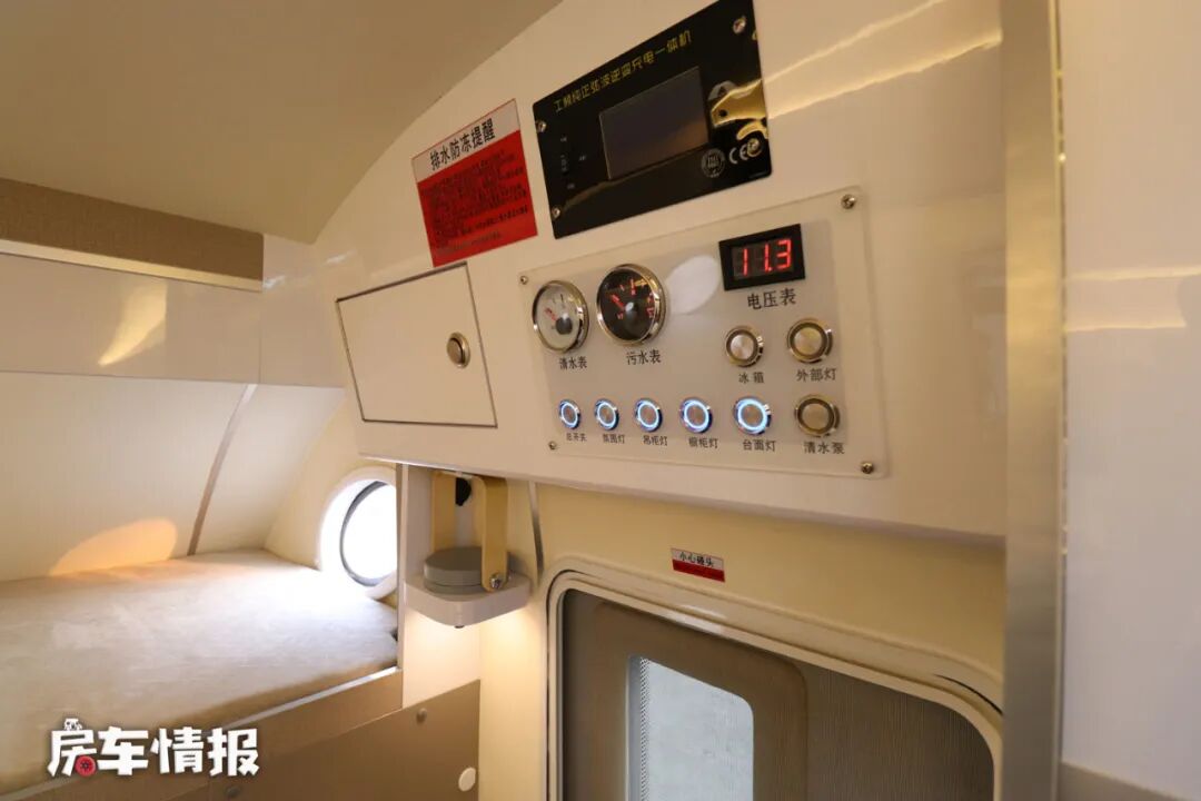 电路上,这款房车搭载了一台3000W的逆变器,提供400Ah锂电池,同时在车顶部还配置了 300W的太阳能板;水路上则拥有110L的净水箱和67L的灰水箱,日常的基础用水用电需求还是可以得到满足的。