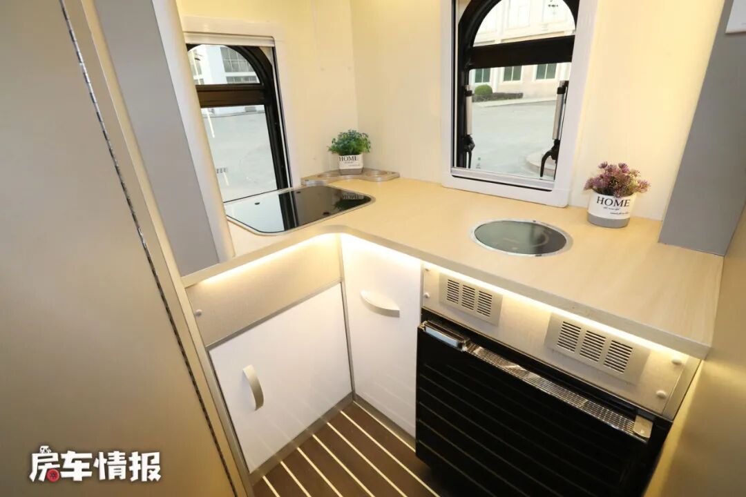 整车的厨房区并不是位于乘客门后方,因为车内宽度有限,所以厨房区移至到了会客区的后方,采用L型吧台式的设计,带有翻盖的不锈钢水槽、电磁炉、50L 的车载冰箱,满足日常的烹饪需求。