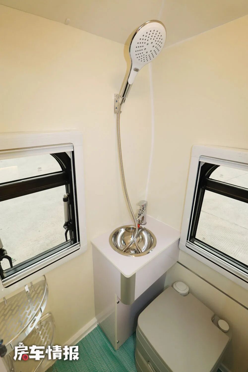 隔壁则是全车的独立卫生间,内部的空间也可以容纳一个人使用,配置了基础的洗手台,还提供了淋浴花洒、置物架以及便携式马桶,可以满足基础的出行洗漱需求。