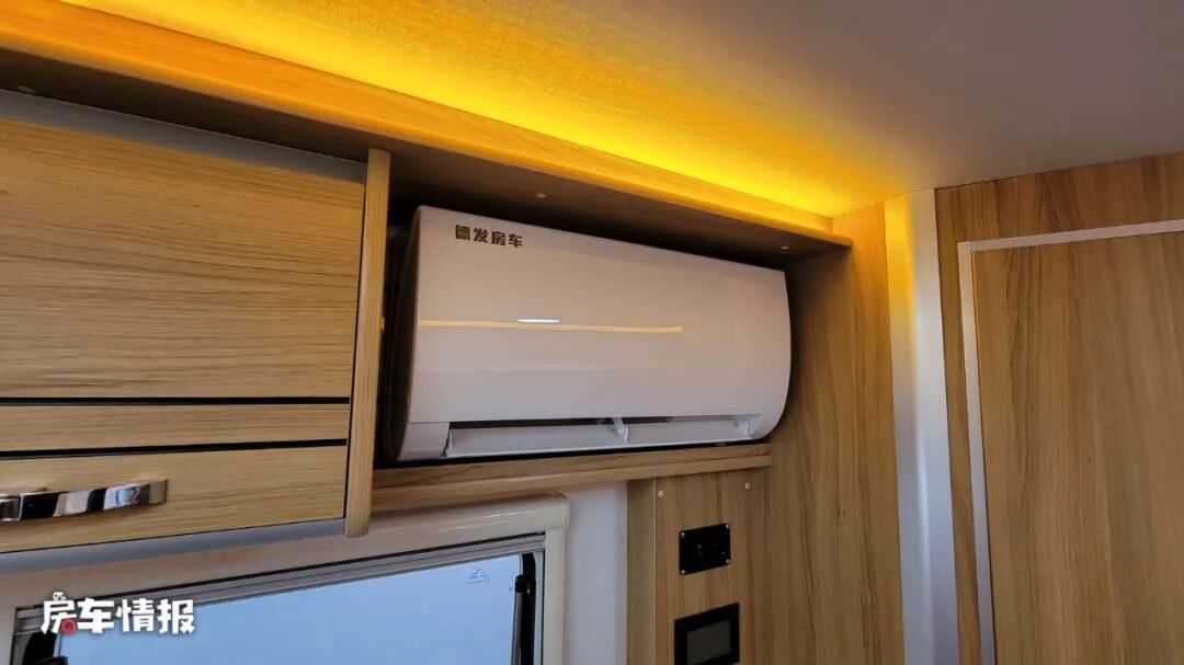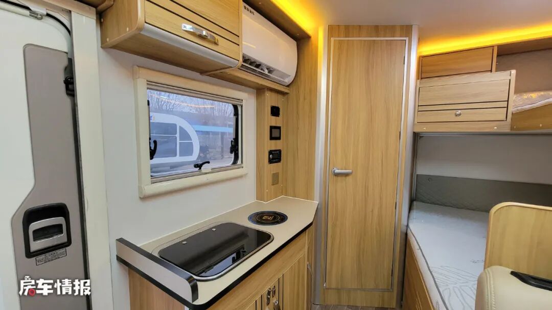 乘客门后方是全车厨房区,整体空间还是非常可观的,台面上带有大尺寸的翻盖水槽以及电磁炉,同时还配置了电源插口,也可以外接其他的小电器,上方嵌入了一台家用变频空调,上下方都提供了大量的储物空间,整体来说,这款车内的储物空间还是比较不错的。