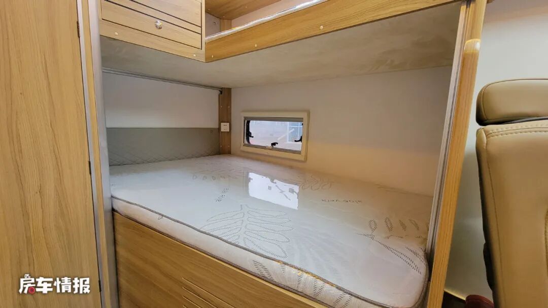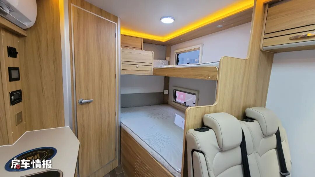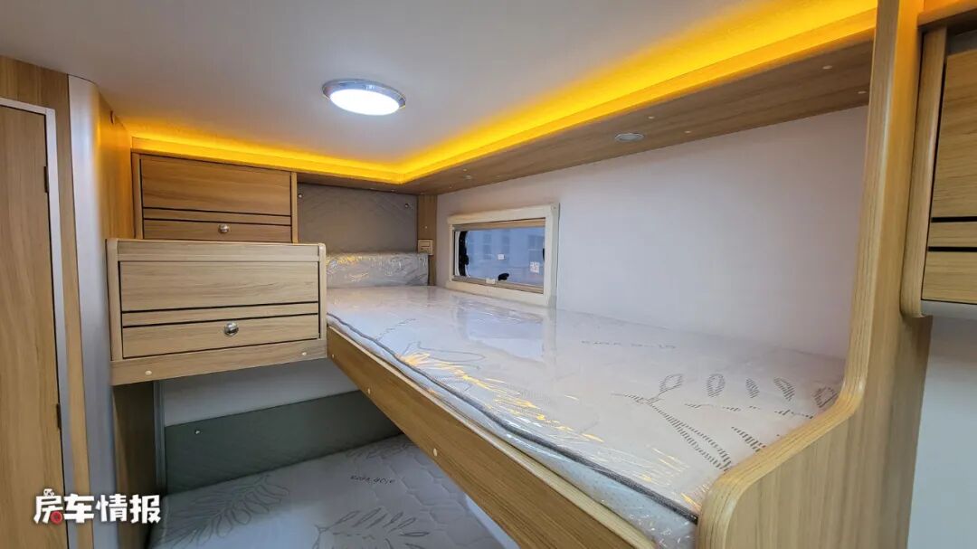 全车的休息区采用了当下比较受欢迎的上下子母床设计,这样可以满足一家三口的使用,上方单人床一侧还提供了阶梯型的储物柜,可以存放一些贴身的物品,另外上下床侧面都配置了外推窗,整体的采光度还是可以保证的。