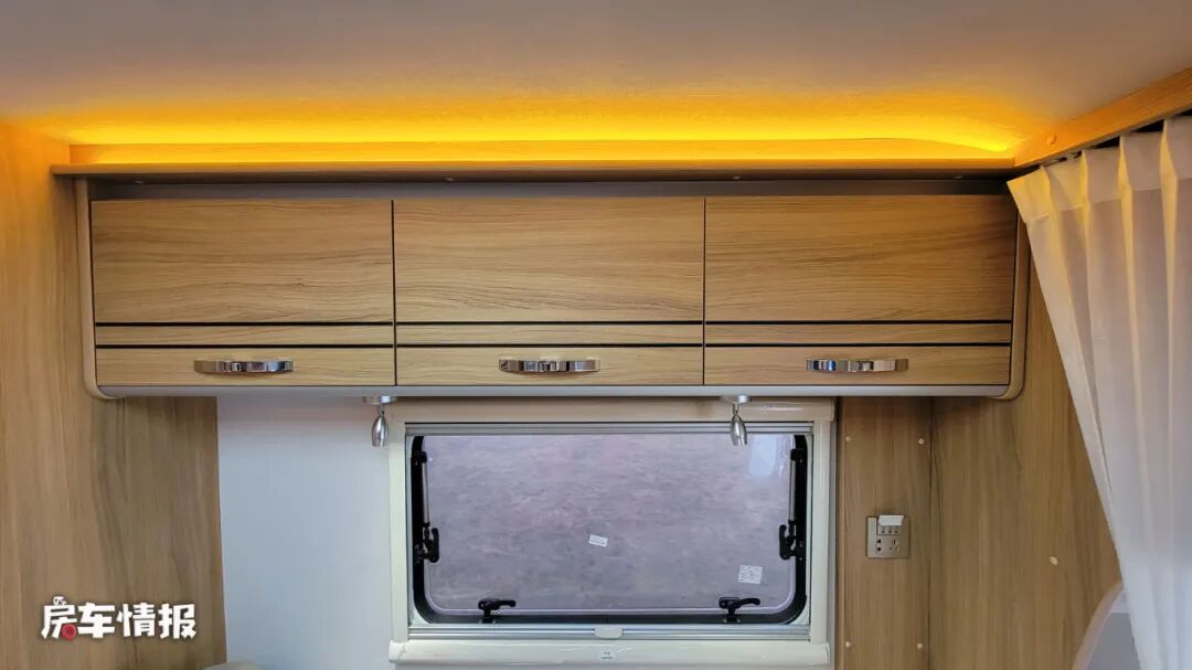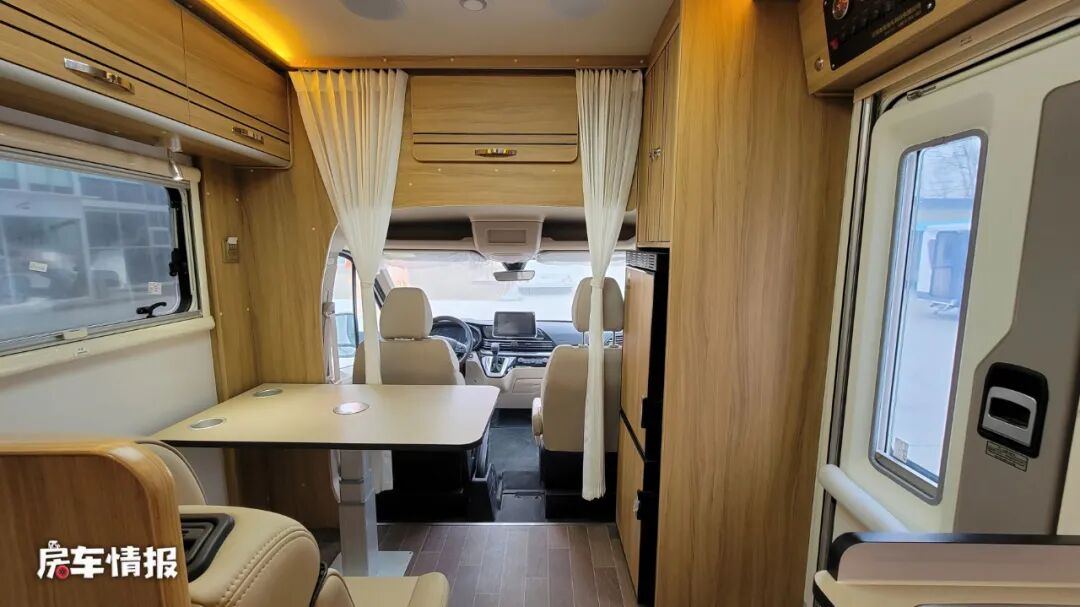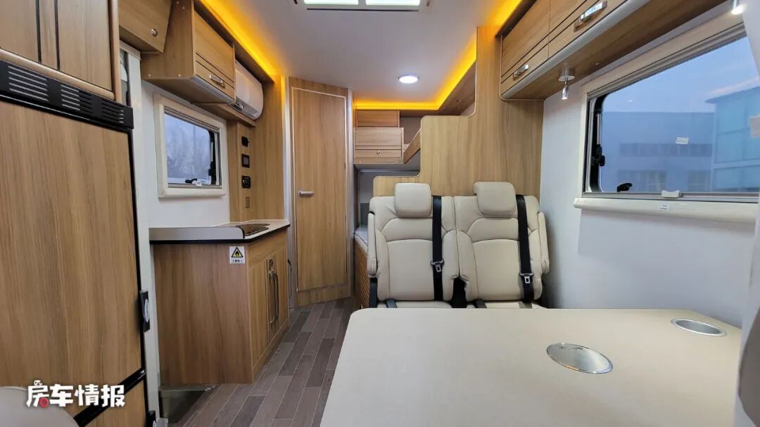 进入车厢内部,整体采用了原木色的家具面板,和黄色的氛围灯相互结合,看起来比较田园温馨,而车内布局也是采用了一个主流的设计,空间上还是比V90底盘的B型房车要宽敞不少。