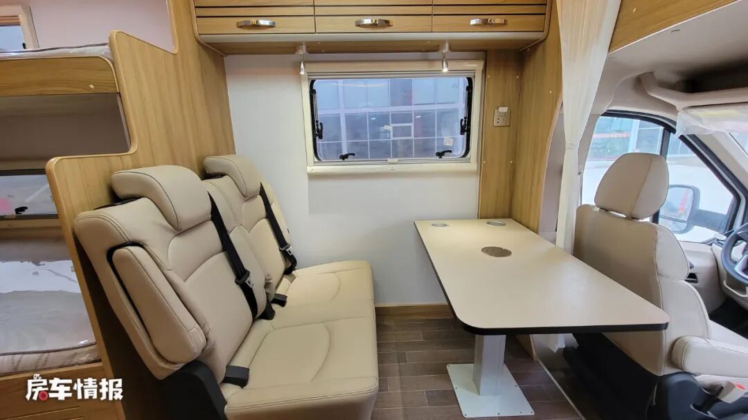 最前方的会客区采用了双人座椅+升降餐桌的设计,顶部配备了基础的吊柜,满足日常一些储物的需求,同时座椅全部使用的是乘用车级别的设计,带有头枕和靠背可调节的功能,能够带来比较舒适的乘坐感受。