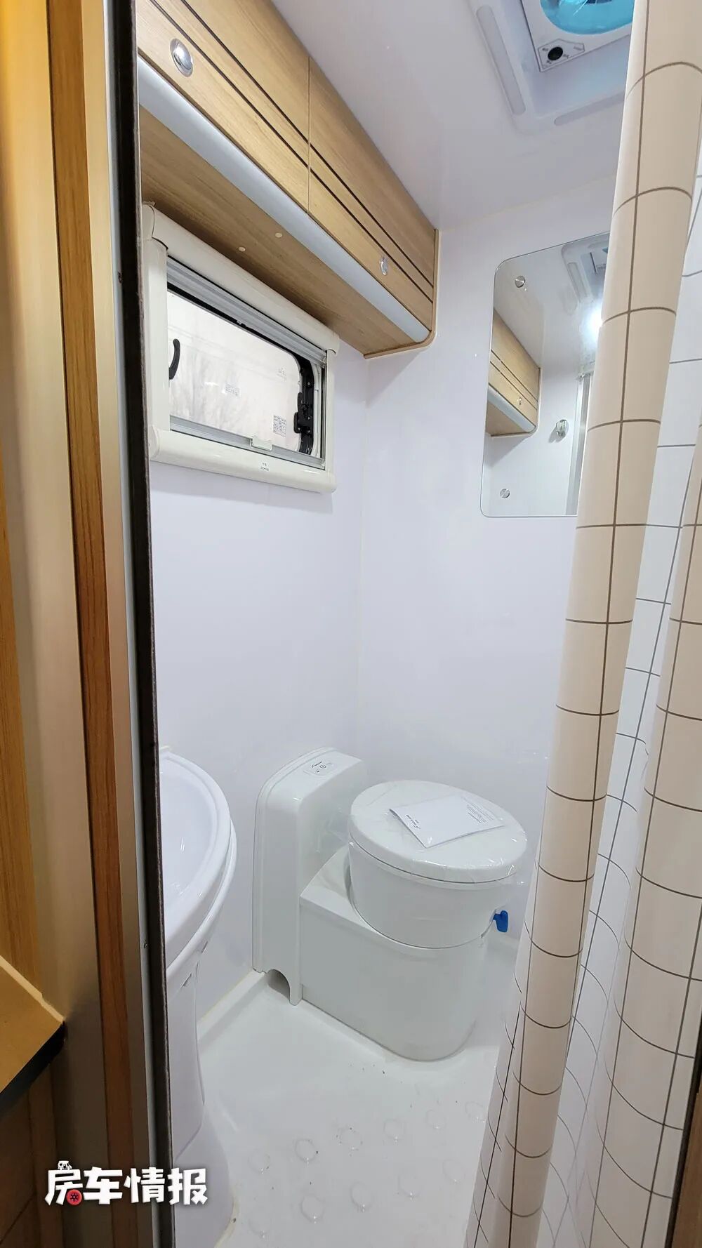 最后是位于车厢尾部的独立卫生间,内部空间较为宽敞,带有马桶、洗手台盆、淋浴花洒、梳妆镜和置物架等,可以满足日常的洗漱需求。