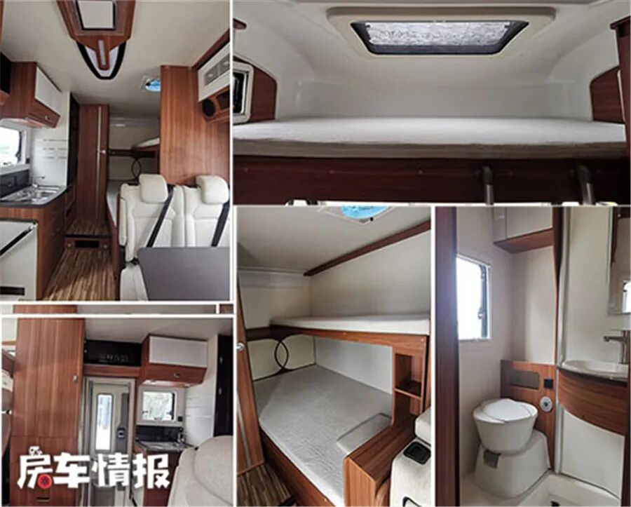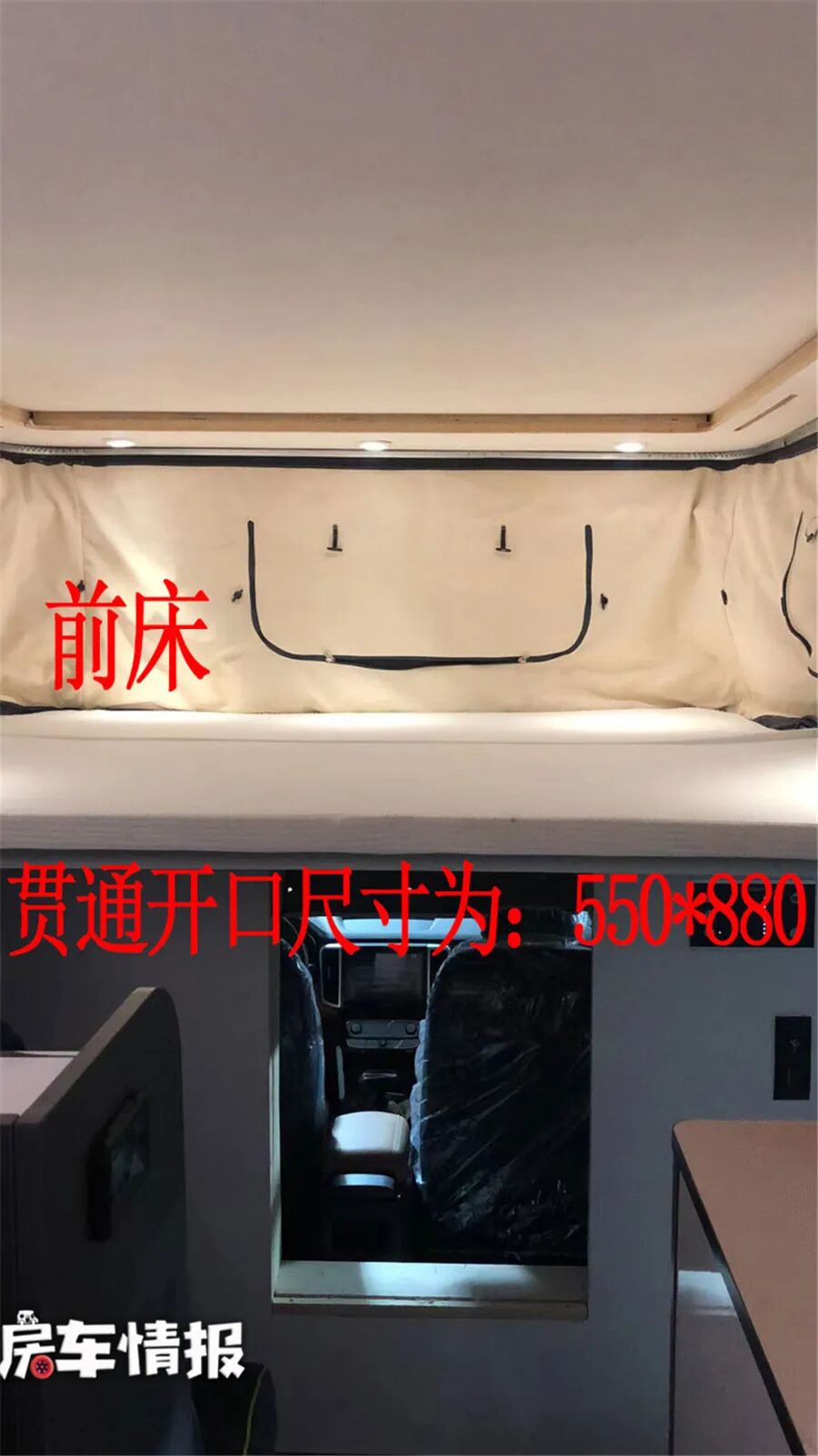 关于这款车的内部,也挺让人意外,全新的布局和以往见到的升顶车型都不一样,车顶升起后,内部垂直高度为1802mm,前方提供了一张额头床,车尾提供一张横置单人床,中部为独立卫生间和厨房区域,由于软顶设计,卫生间上部分为浴帘形式,前方会客区采用双人正向座椅,整车核载4人。关于这款车的更多详情可以持续关注房车情报。