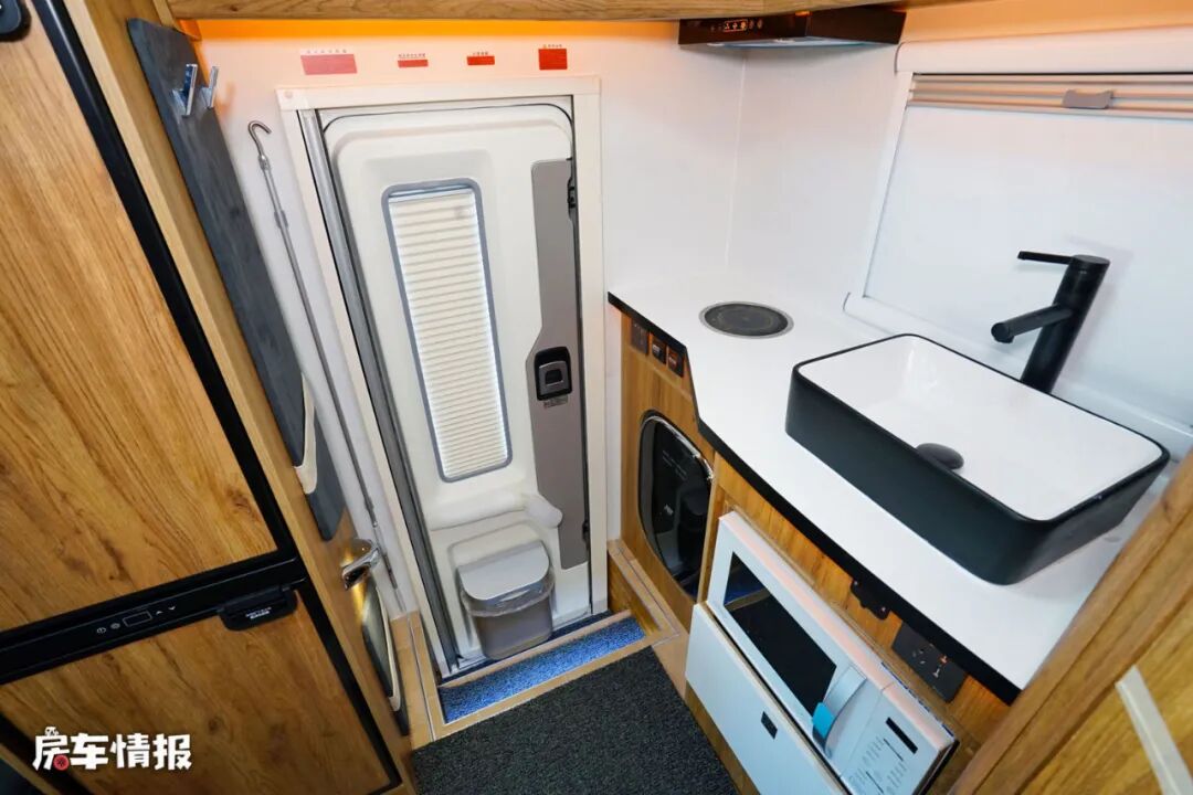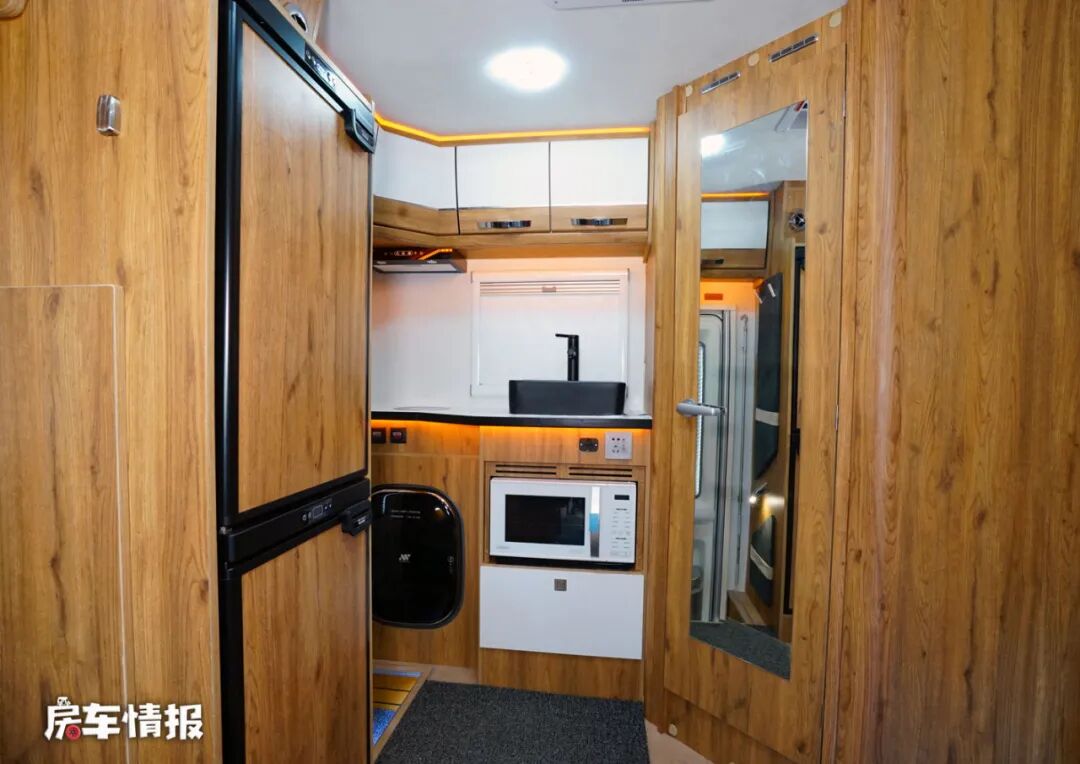 因为采用后上门的设计,所以全车内部也是后置的厨房区,操作台上配置了基础的电磁炉以及凸起的陶瓷水槽,上方还提供了抽油烟机,下方则配置了一台小型的洗衣机和一台微波炉,完全可以满足日常的生活需求。