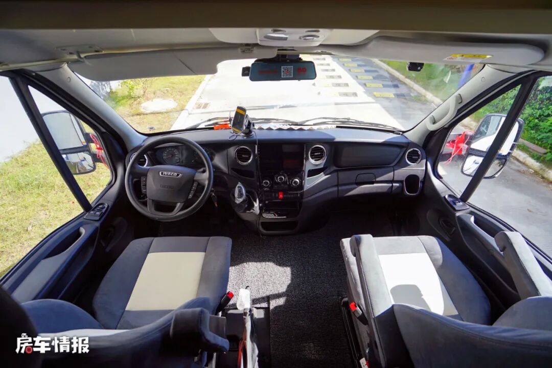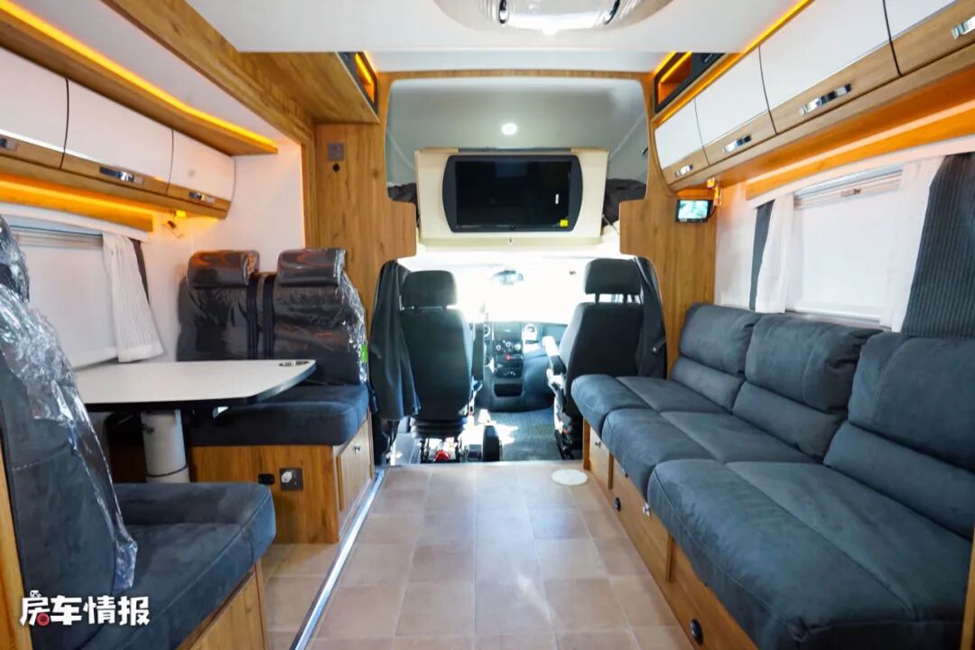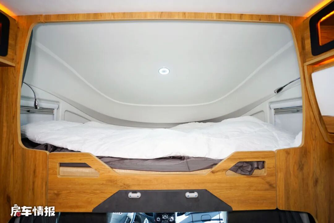车前方驾驶室顶部是额头休息区,提供了一张大尺寸的双人床,两侧还匹配了外推窗,以保证这个区域的采光度,翻起床板则可以看到位于下方的一台32寸液晶电视,也能为日后的旅行生活提供基础的娱乐需求。