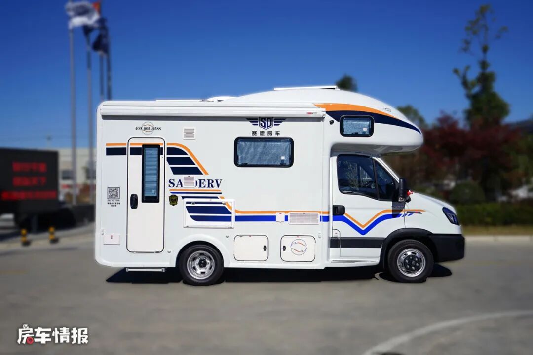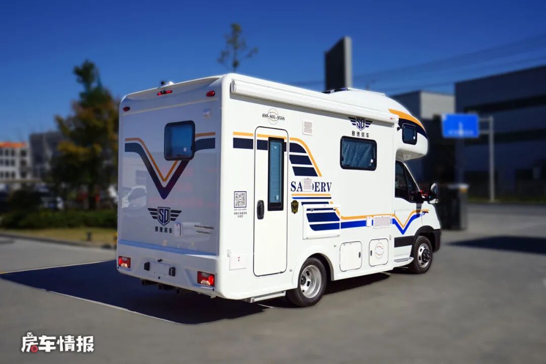 车身外部还是采用了经典的蓝色和黄色拉花的设计,并提供了遮阳棚、外置翻板、外置抽拉灶台、外置淋浴花洒以及水电接驳口等,方便后期使用。