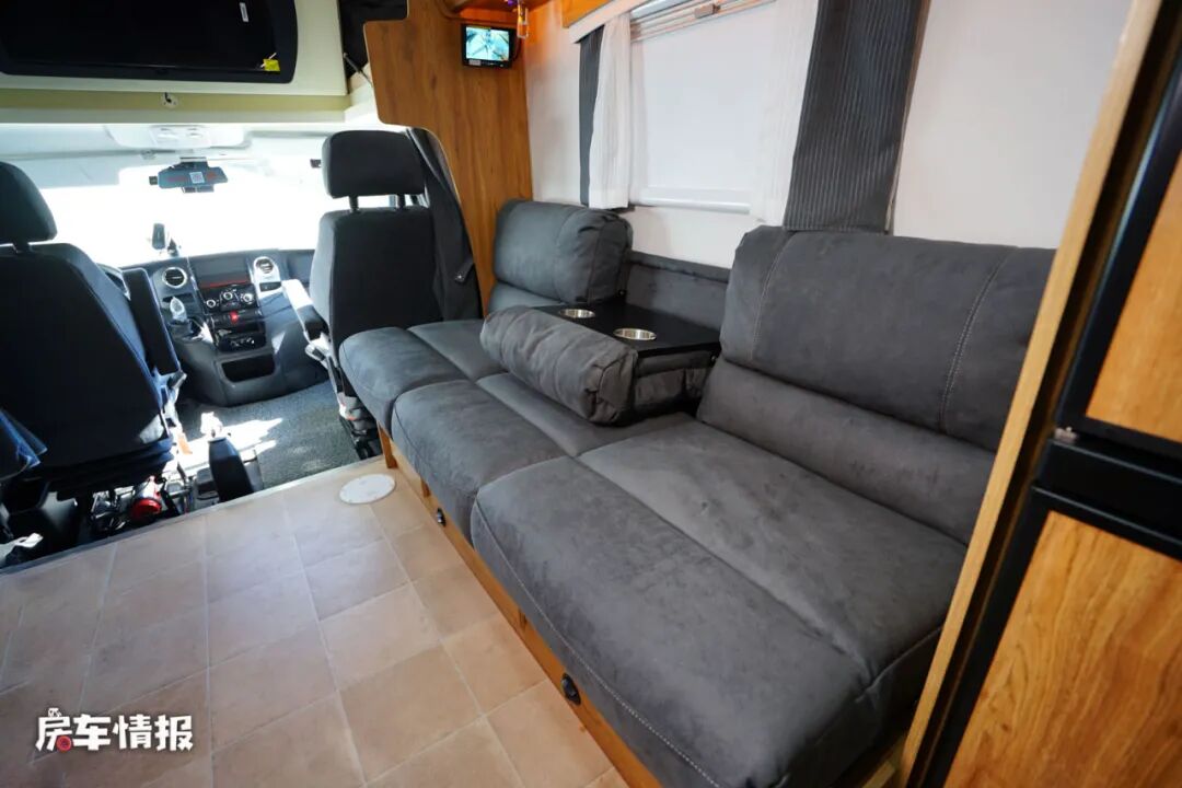 与之相对的是一张长条的沙发,但是注意的是行车时是不能够坐人的,夜晚则可以将沙发拓展成一张双人沙发床。