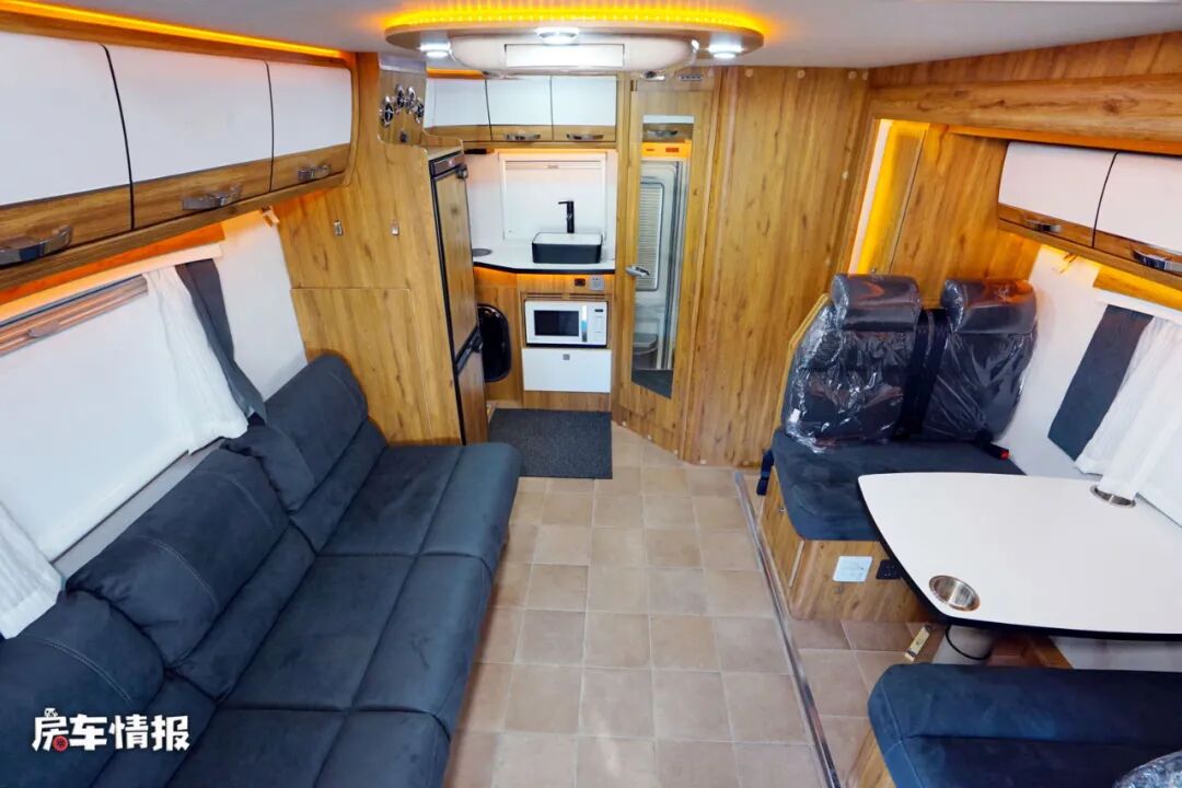 和以往我们常见白鲸房车的设计不同的是,这款房车是采用了后上门的设计方式,车内的布局则是一个标准的单拓展布局,棕咖色的配色也充满了轻奢的风格。