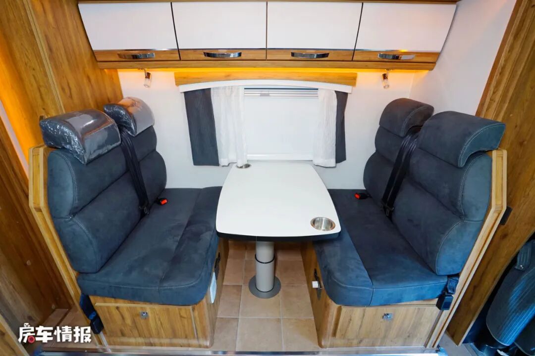 车厢中部则是全车的会客休息区域,在拓展舱内的是经典的四人对卡座沙发+升降餐桌的布局设计,同时匹配了四条安全带,结合主副驾驶座椅,全车在行驶过程中最多可以乘坐6个人。会客区顶部还提供了基础的吊柜,可以存放一些日常用品,也方便后期拿,晚上睡觉的时候,也可以将其拼接成一张临时的沙发床使用。