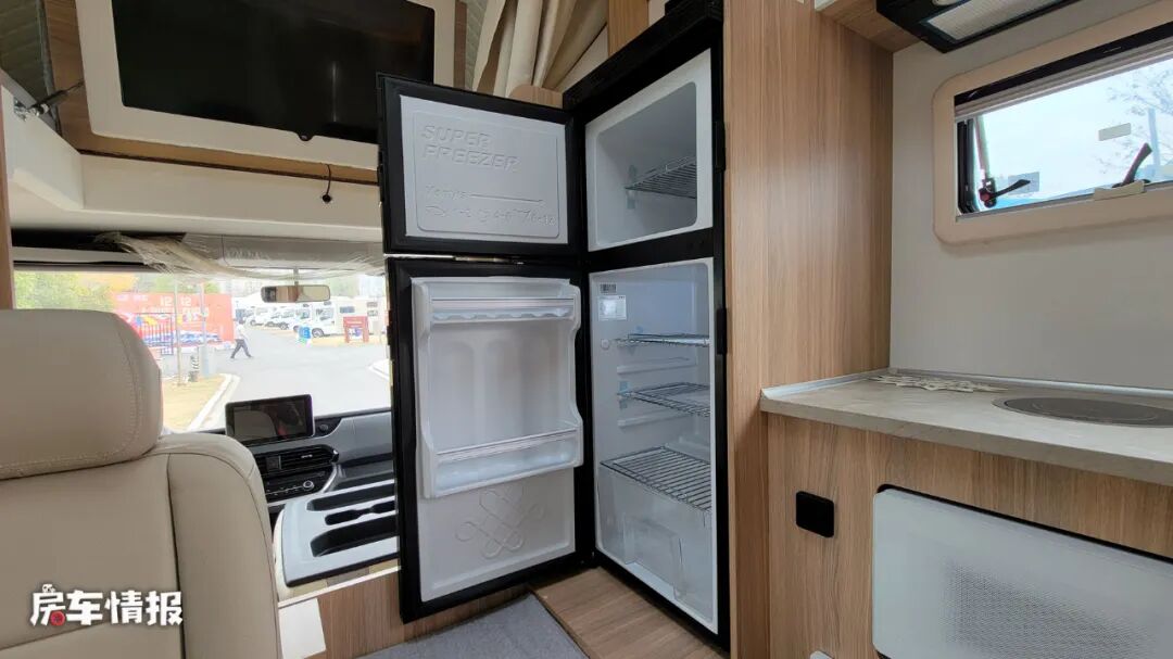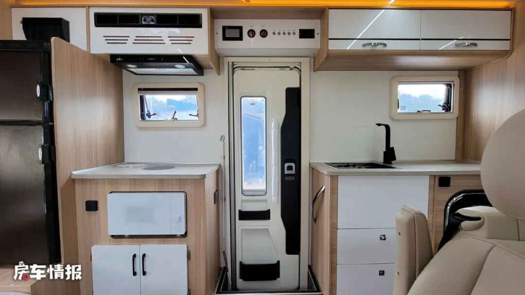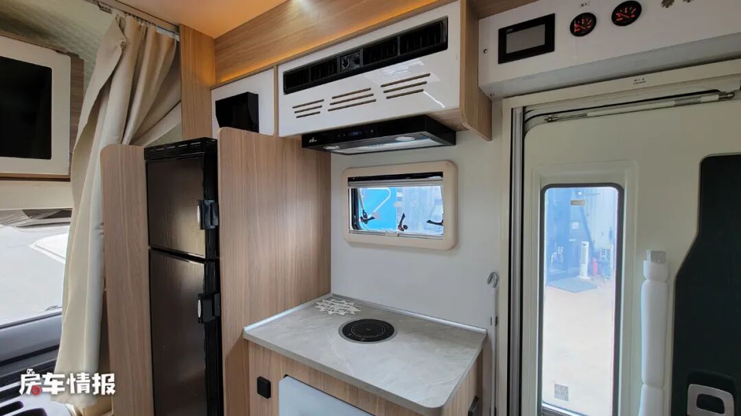 因为整车是采用的中部上门的设计,所以厨房区采用了一前一后两个操作台的设计,乘客门前方是一台148L上下双开门的冰箱,以及一个小型的灶台区,桌面配置了电磁炉,顶部带有抽油烟机,下方嵌入了微波炉,可以满足日常的基本烹饪需求。