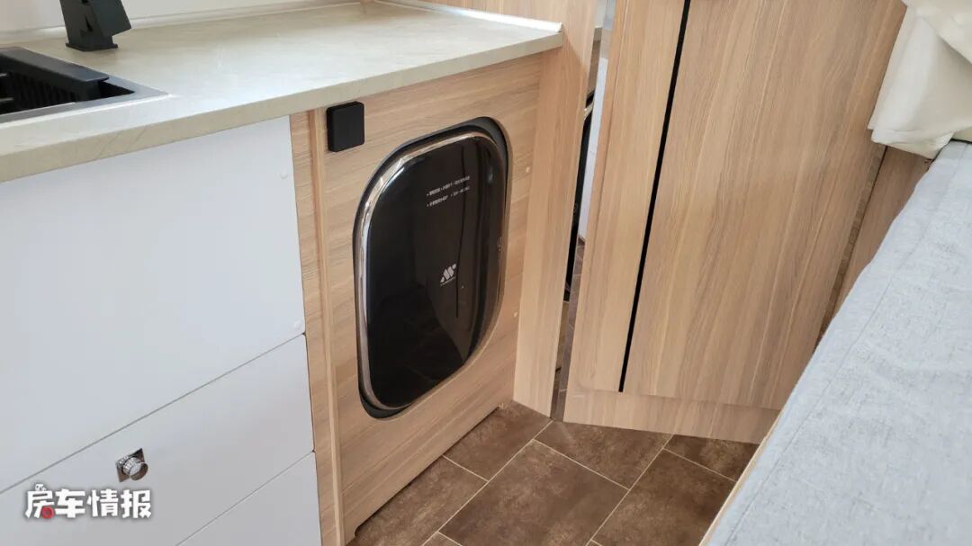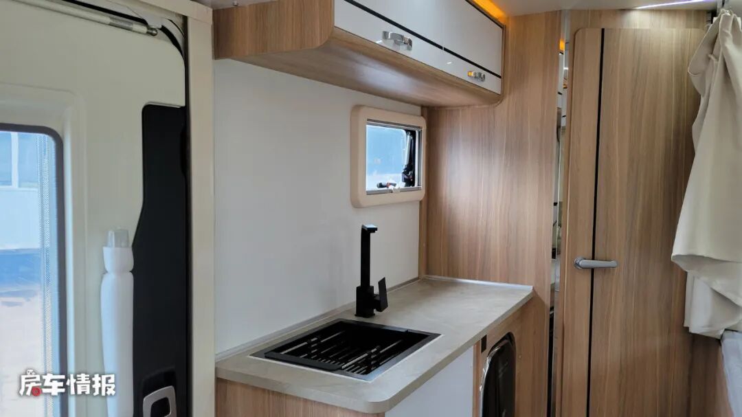 乘客门后方则是一个带有不锈钢洗菜池以及迷你洗衣机的长条操作台,空置的桌面还可以用来备菜或放置物品,整体的空间表现还是不错的,当然这也是轻卡房车的自带优势。