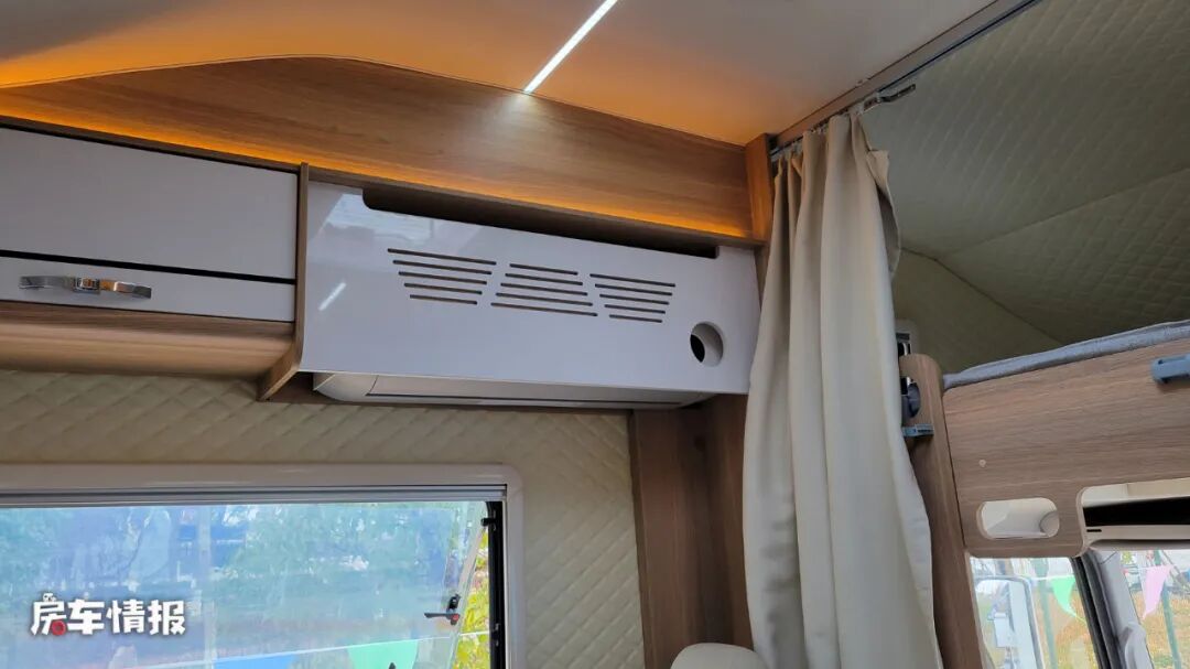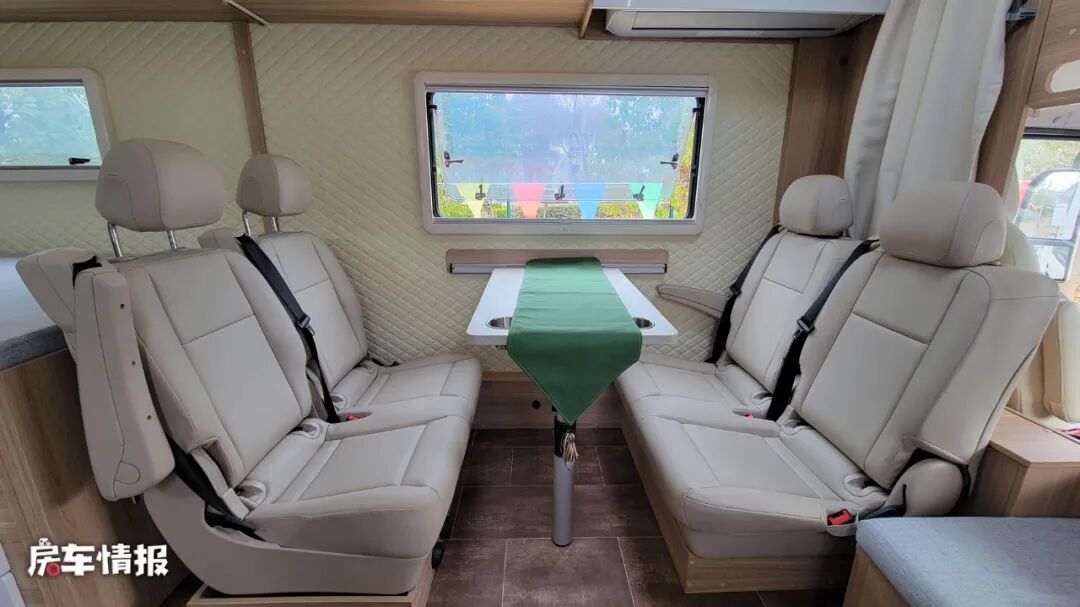 这款车的会客区采用的是四人对卡座沙发+升降餐桌的设计,座椅全部使用的是乘用车级别座椅,也能缓解长途跋涉的不适感。顶部则配置了基础的吊柜和隐藏了一台家用变频空调。