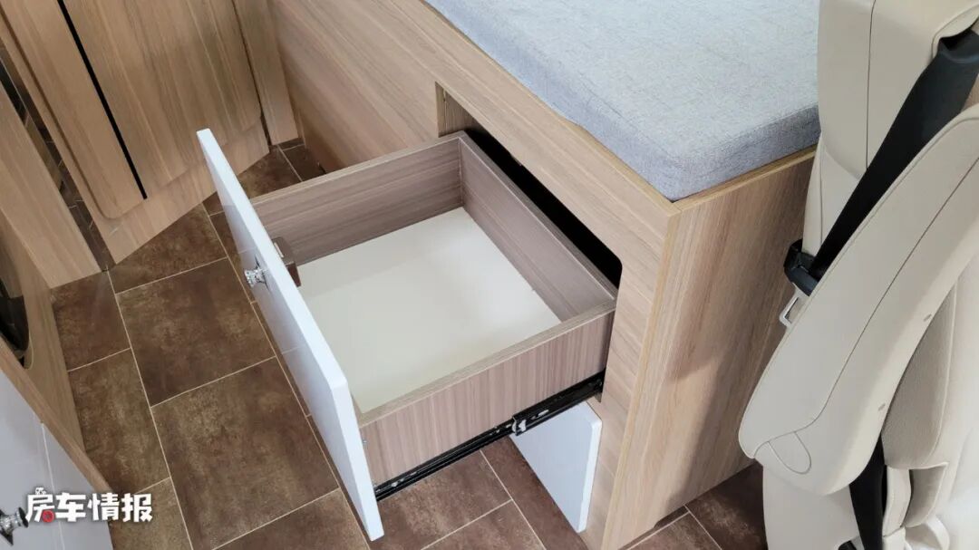 最后是位于车厢尾部的休息区,采用了比较主流的纵置床设计,顶部提供储物吊柜,床铺下方也配置了两层小型的储物抽屉,可以存放一些内衣裤和袜子,方便日后拿取。