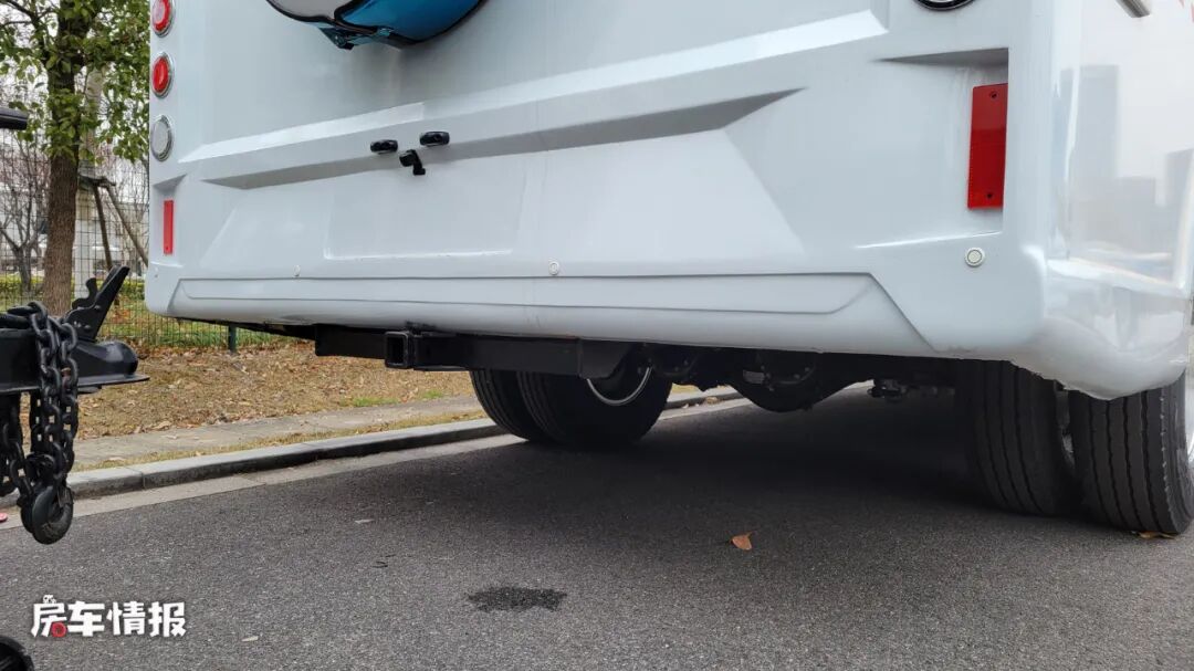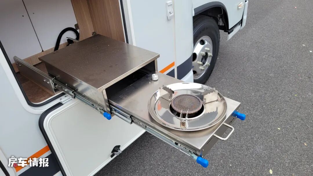 车身外部的配置比较简洁,只提供了基础的遮阳棚、抽拉式灶台和储物舱,尾部则配置了备胎以及拖车方口,方便日后使用。