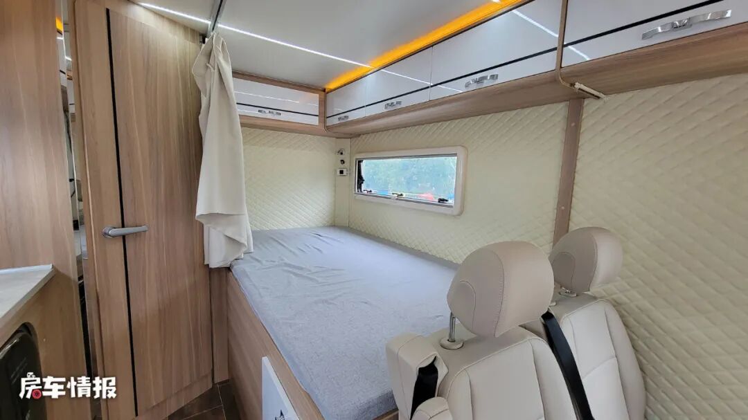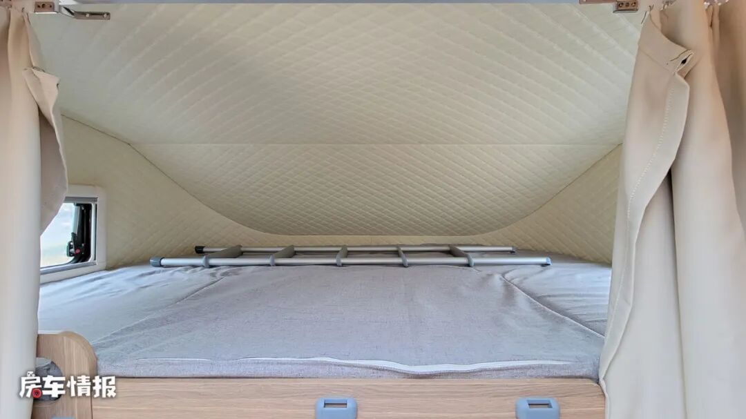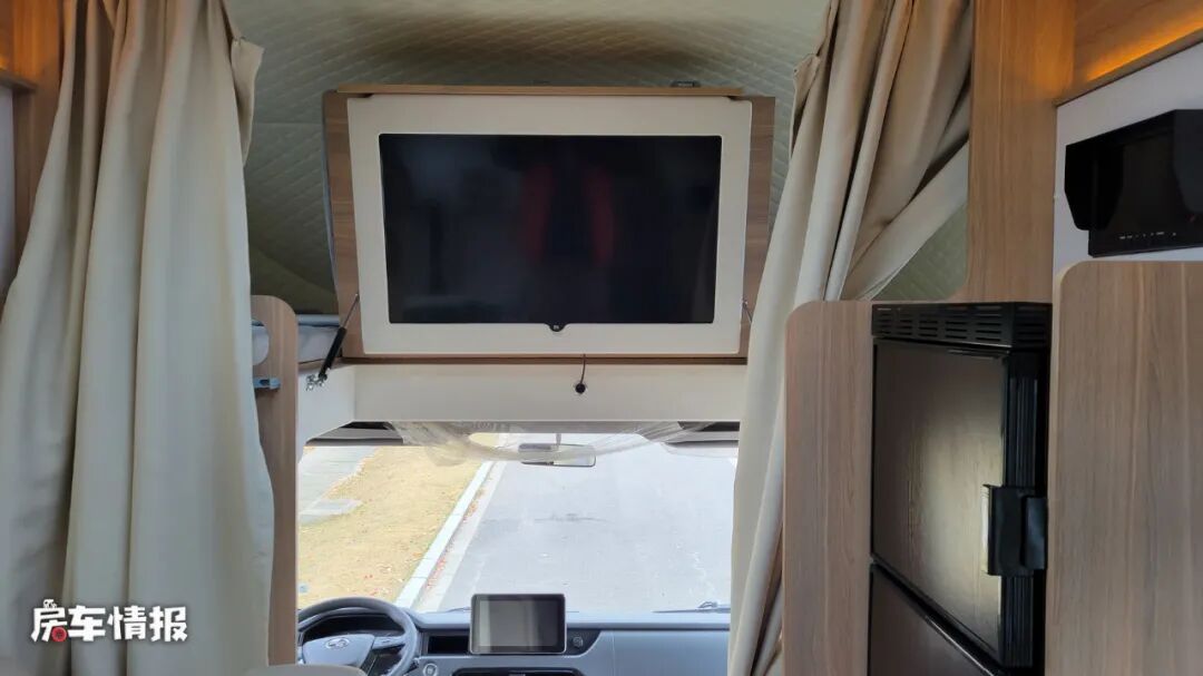 最前方驾驶室上方标配一张尺寸为2200*1400mm的额头双人床,满足日常两个人的睡眠需求,当然也可以作为储物空间使用,床板下方则是一台32寸的液晶电视,日常休息的时候也可以看看电视放松一下。