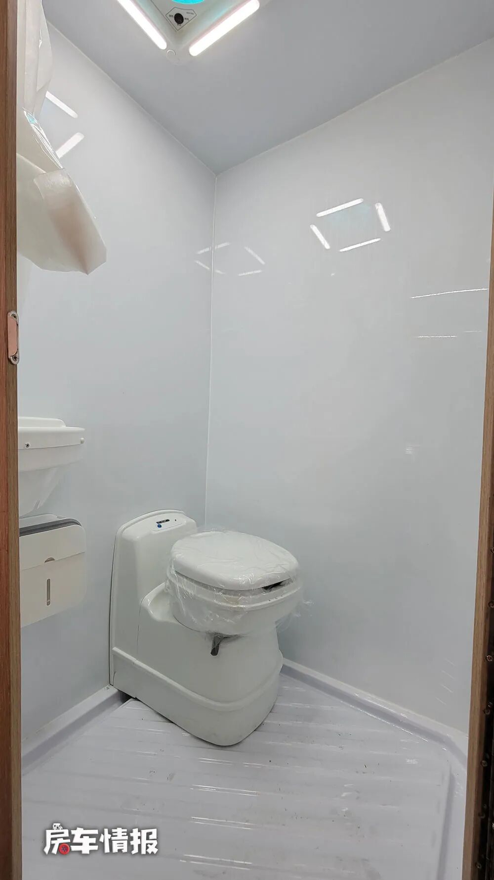 厨房区后方是整车的卫浴室,内部空间也比较宽敞,配置上也很完善,提供了包括马桶、洗手台、淋浴花洒、梳妆镜和换气扇在内的设施,可以满足出行的洗漱需求。