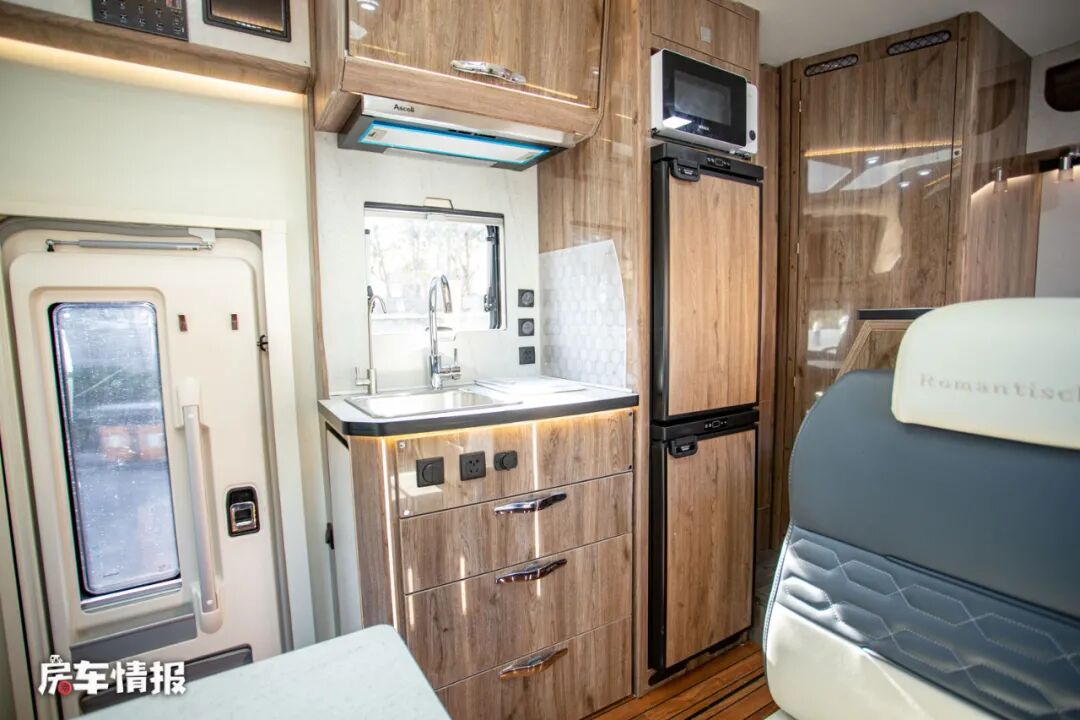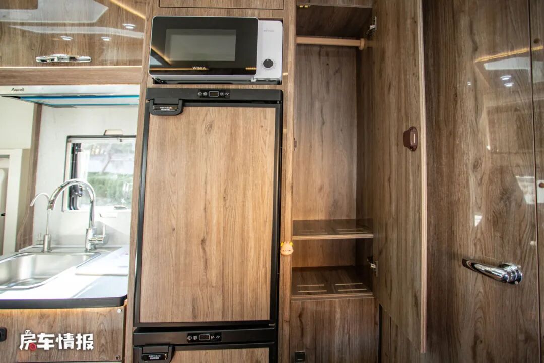 厨房区位于乘客门的后方,常规下的面积并不太理想,但是侧面提供了超大的拓展翻板,打开后完全可以作为备菜区使用,台面上提供了不锈钢洗菜池以及电磁炉,上方还配备了单独的抽油烟机,以缓解油烟对车内的影响,后方则是一台152L上下双开门可满足分类存放食材的冰箱,上方还带有一台微波炉,可以满足日常的烹饪需求。