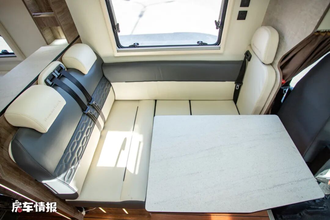 整车的会客区采用了当下比较受欢迎L型沙发+升降餐桌的设计,餐桌是可六向调节的,方便日后使用的时候进出,沙发上配置了两条安全带,所以整车在行车过程中最多可以乘坐四个人。