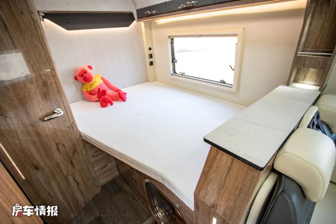 在最前方驾驶室顶部的额头区域内,标配一张双人床,尺寸为2000*1450mm,而拥有三面环窗的设计也使得整个额头区域看起来极为通透。