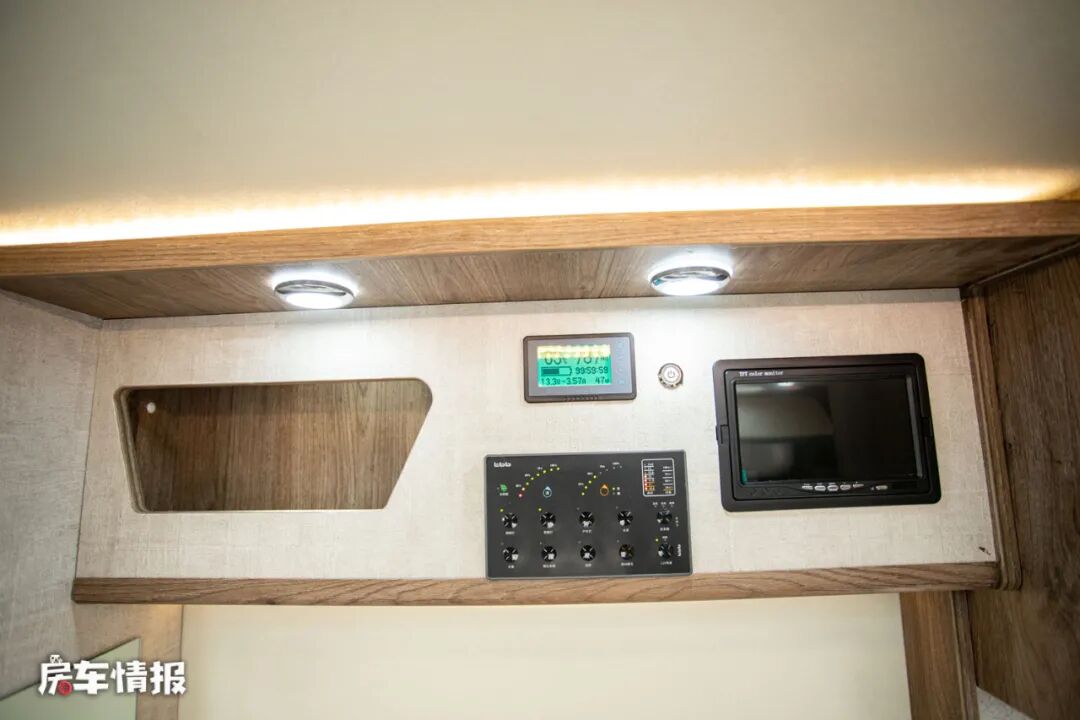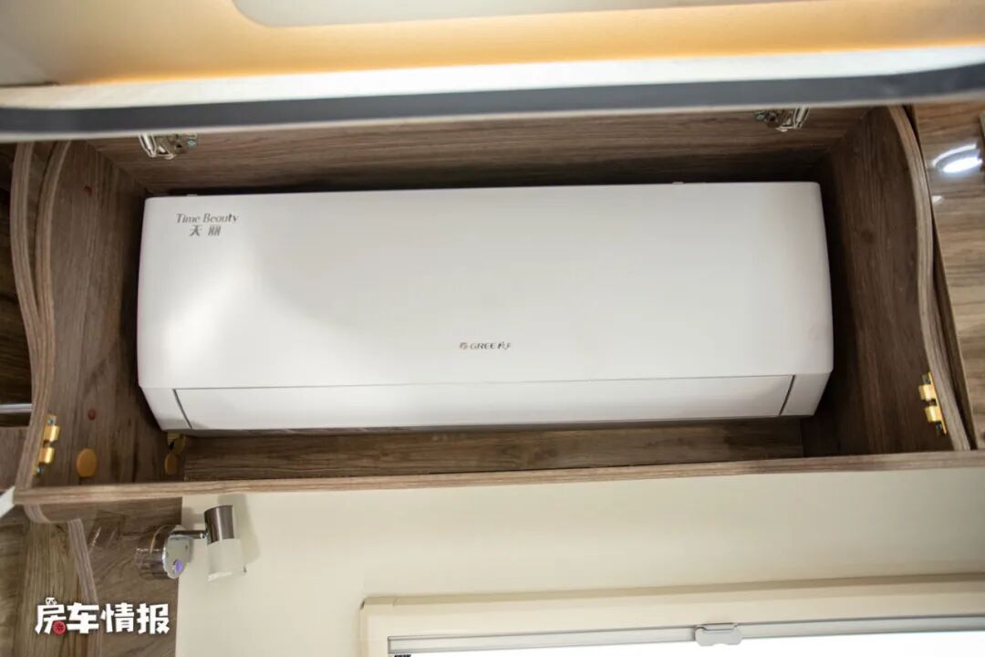 在会客区顶部隐藏了一台家用变频空调,可以按需调节车内的温度,从而达到一个舒适的居住环境。