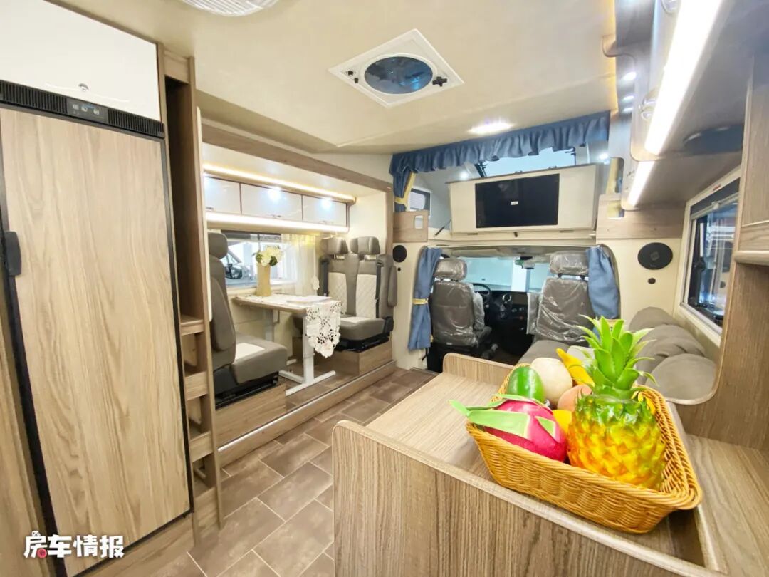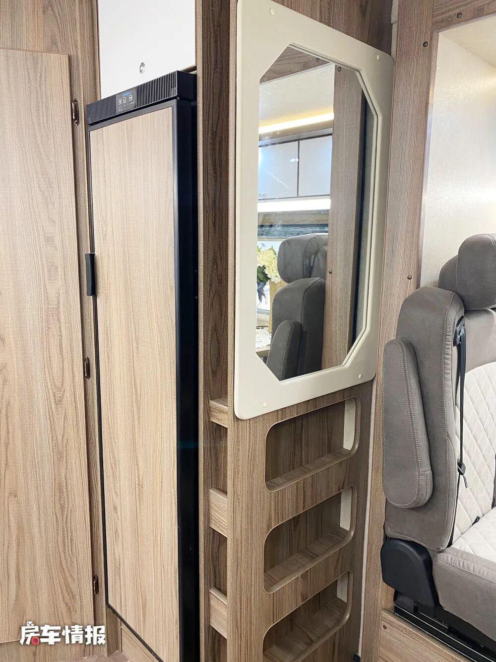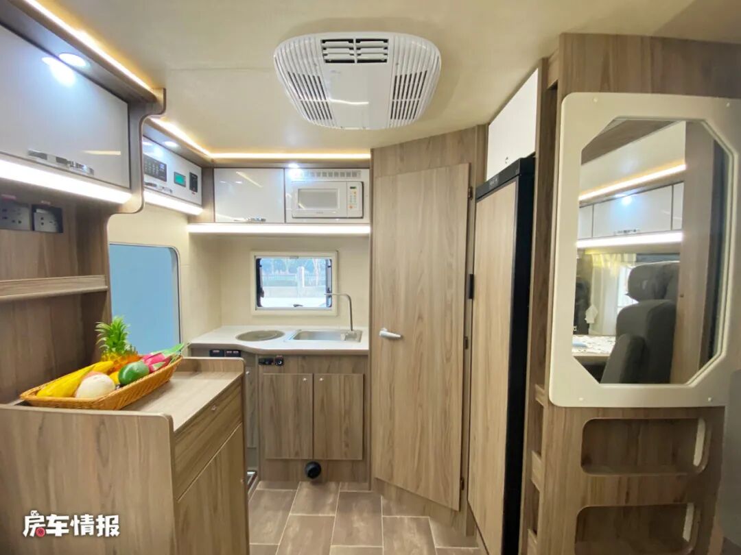 因为采用了后上门的设计,所以全车也使用了后置厨卫区的布局,在会客区后方是一台150L带有单独冷冻区域的单开门冰箱,可以满足日常存放食材的需求。