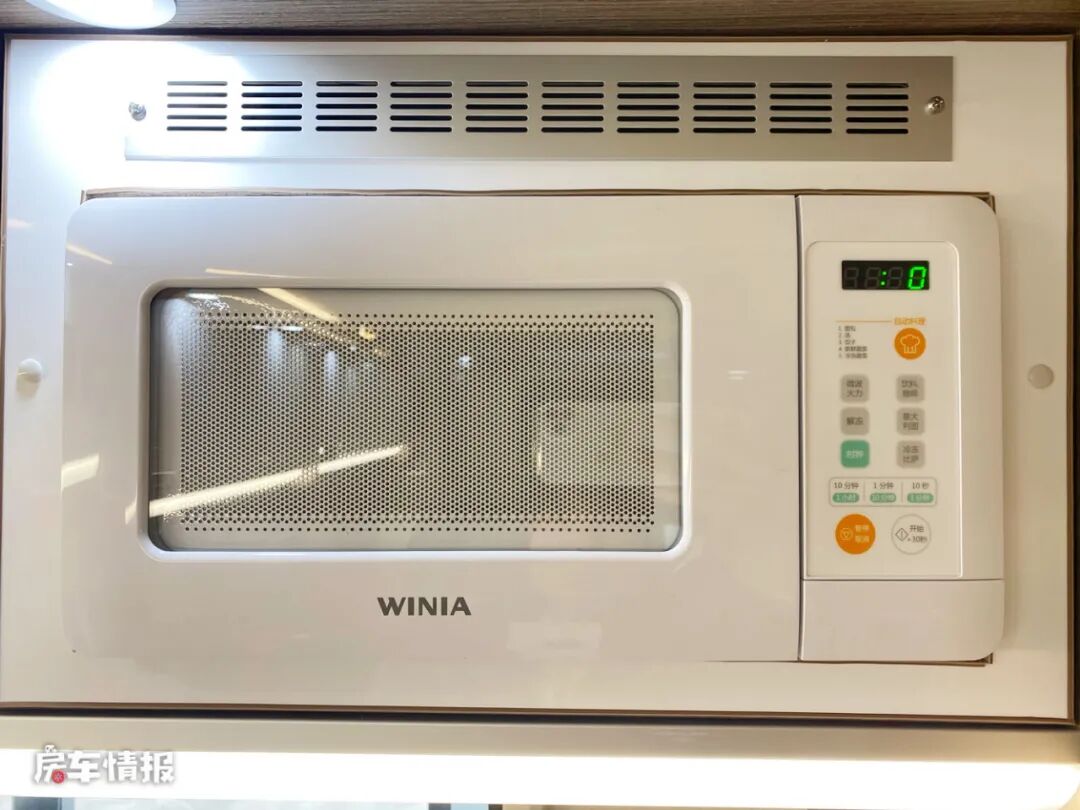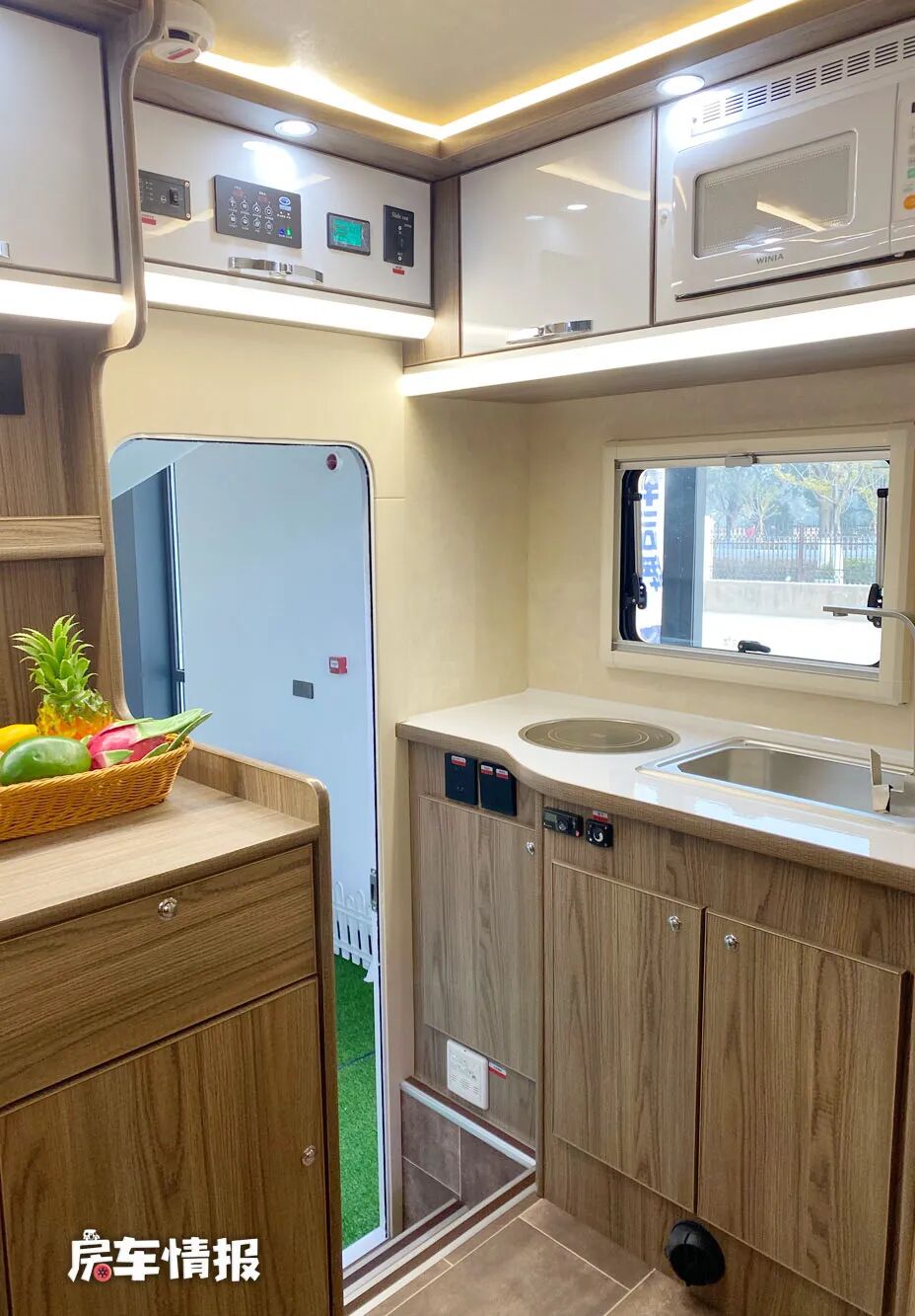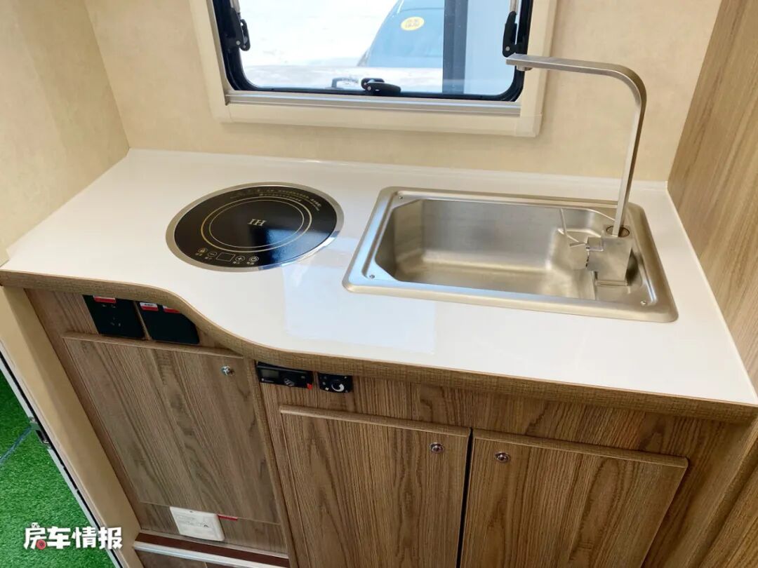 厨房主操作台位于车厢最尾处,台面上提供了大功率的电磁炉以及不锈钢的洗菜盆,上方还嵌入了一台微波炉,下方则提供了基础的储物空间,整体完全可以满足日常的烹饪需求。